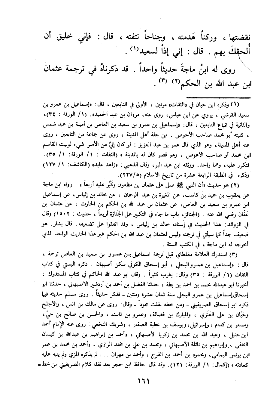 (2) هو حديث: "أن النبي صلى الله عليه وسلم صلى على عثمان بن مظعون وكبر عليه أربعا". رواه ابن ماجة عن يعقوب بن حميد بن كاسب، عن المغيرة بن عبد الرحمن، عن خالد بن الياس، عن إسماعيل ابن عَمْرو بن سَعِيد بن العاص، عن عثمان بن عَبد الله بن الحكم بن الحارث، عن عثمان بن عفان رضي الله عنه. (الجنائز، باب ما جاء في التكبير على الجنازة أربعا، حديث: 1502) وَقَال في الزوائد: هذا الحديث في إسناد خالد بن إلياس، وقد اتفقوا على تضعيفه. قال بشار: هو ضعيف جدا كما سيأتي في ترجمته وليس لعثمان بن عَبد الله بن الحكم غير هذا الحديث الواحد الذي أخرجه ابن ماجة، في الكتب الستة.