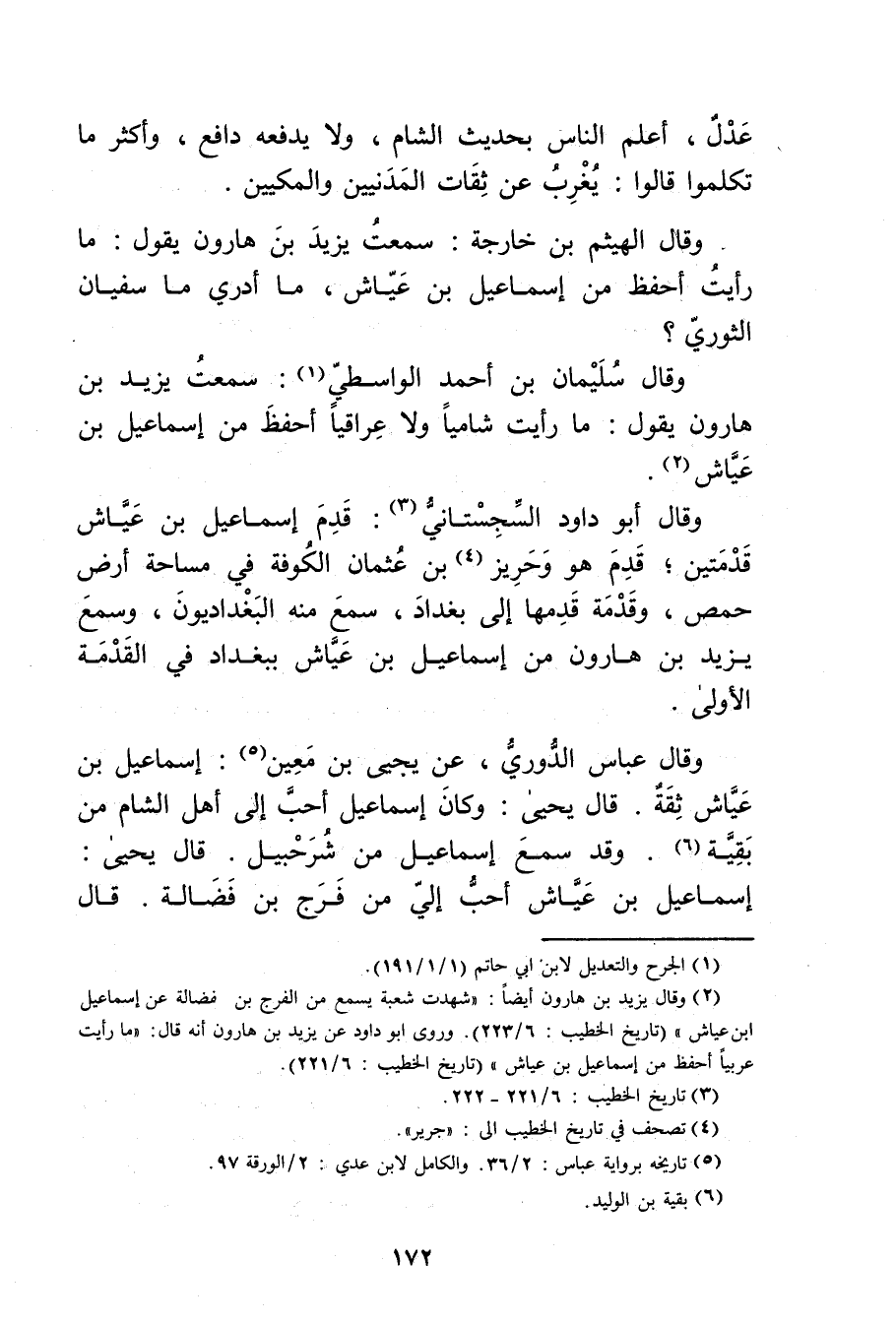 (2) وَقَال يزيد بن هارون أيضا: شهدت شعبة يسمع من الفرج بن فضالة عن إسماعيل ابن عياش" (تاريخ الخطيب: 6 / 223) . وروى أَبُو دَاوُدَ عَنْ يَزِيدَ بْنِ هارون أنه قال: ما رأيت عربيا أحفظ من إِسْمَاعِيل بْن عياش" (تاريخ الخطيب: 6 / 221) .