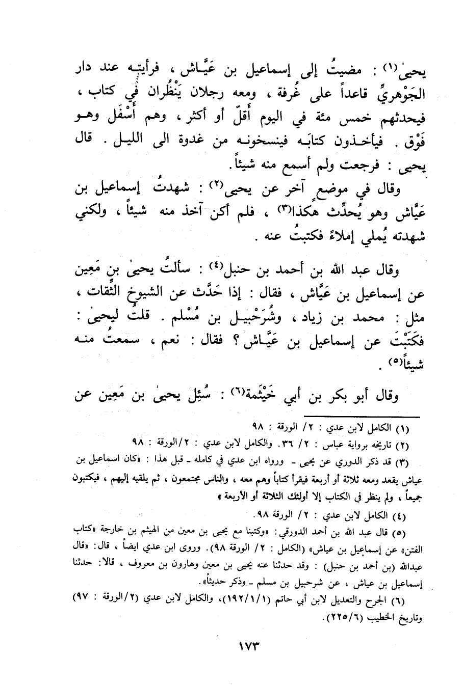 (5) قال عَبد اللَّهِ بْن أَحْمَد الدورقي: وكتبنا مع يحيى بن مَعِين من الهيثم بن خارجة"كتاب الفتن"عن إسماعيل بن عياش" (الكامل: 2 / الورقة: 98) . وروى ابن عدي ايضا، قال: قال عَبد اللَّهِ (بْن أحمد بن حنبل) : وقد حَدَّثَنَا عنه يحيى بن مَعِين وهارون بن معروف، قالا: حَدَّثَنَا إسماعيل بن عياش، عن شرحبيل بن مسلم - وذكر حديثًا.