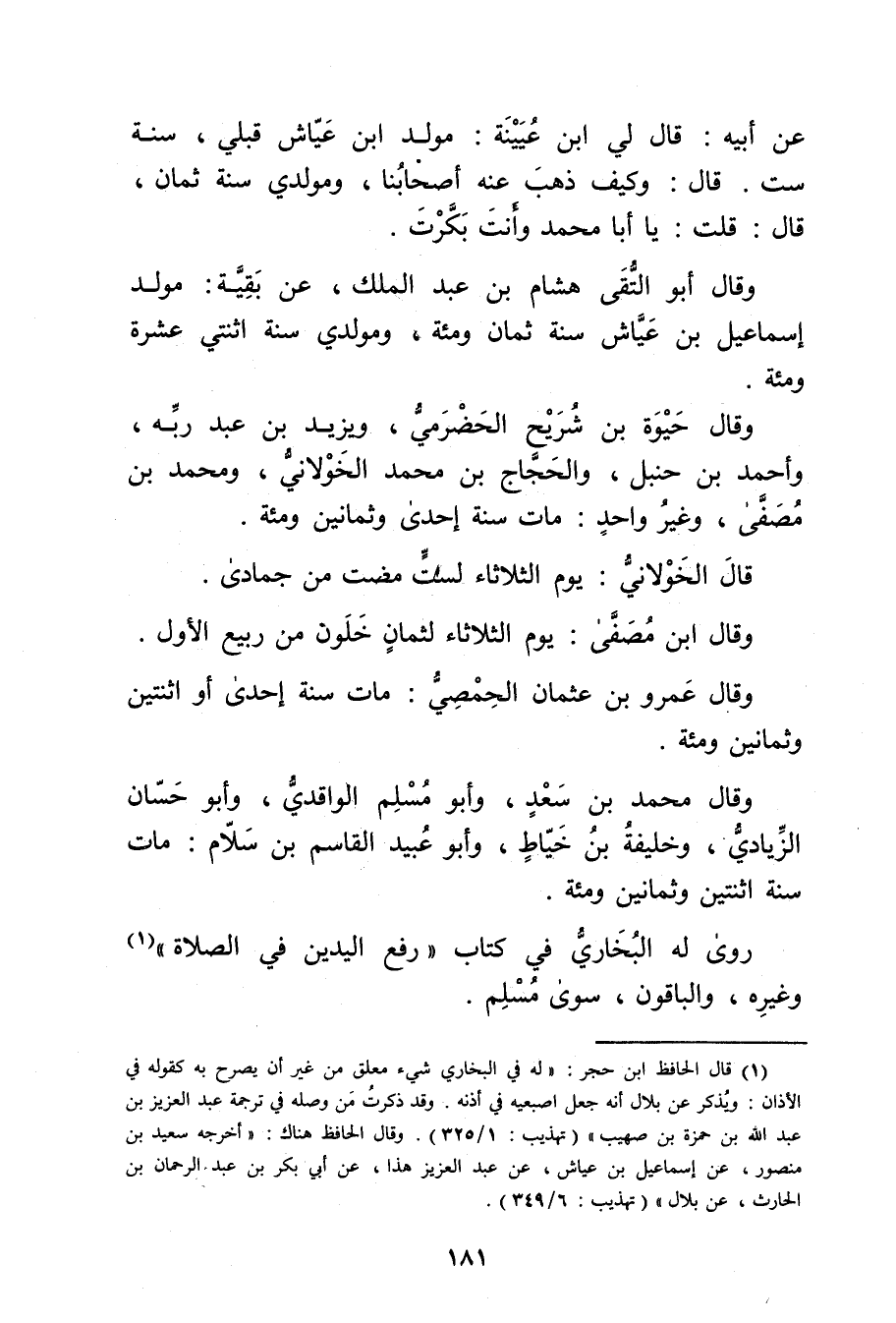 (1) قال الحافظ ابن حجر: له في البخاري شيء معلق من غير أن يصرح به كقوله في الاذان: ويذكر عن بلال أنه جعل اصبعيه في أذنه. وقد ذكرت من وصله في ترجمة عَبْد العزيز بْن عَبد اللَّهِ بْن حمزة بْن صهيب" (تهذيب: 1 / 325) . وَقَال الحافظ هناك: أخرجه سَعِيد بن منصور، عَنْ إِسْمَاعِيلَ بْنِ عياش، عن عبد العزيز هذا، عَن أَبِي بَكْرِ بْن عَبْدِ.