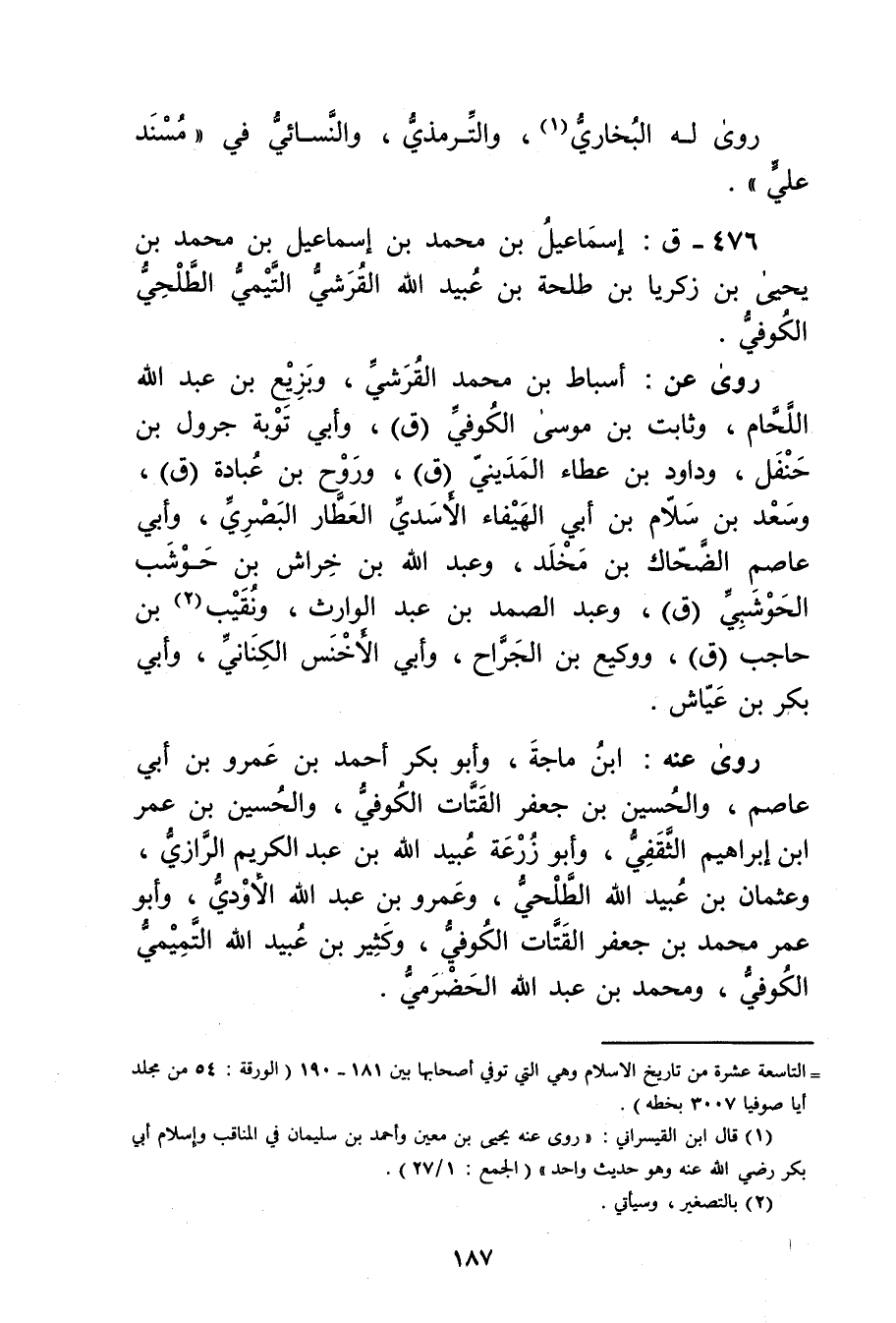 (476) - ق: إِسْمَاعِيل بْن مُحَمَّد بْن إِسْمَاعِيل بْن مُحَمَّد بن يَحْيَى بن زَكَرِيَّا بْن طلحة بْن عُبَيد الله القرشي التَّيْمِيّ الطلحي الكوفي.