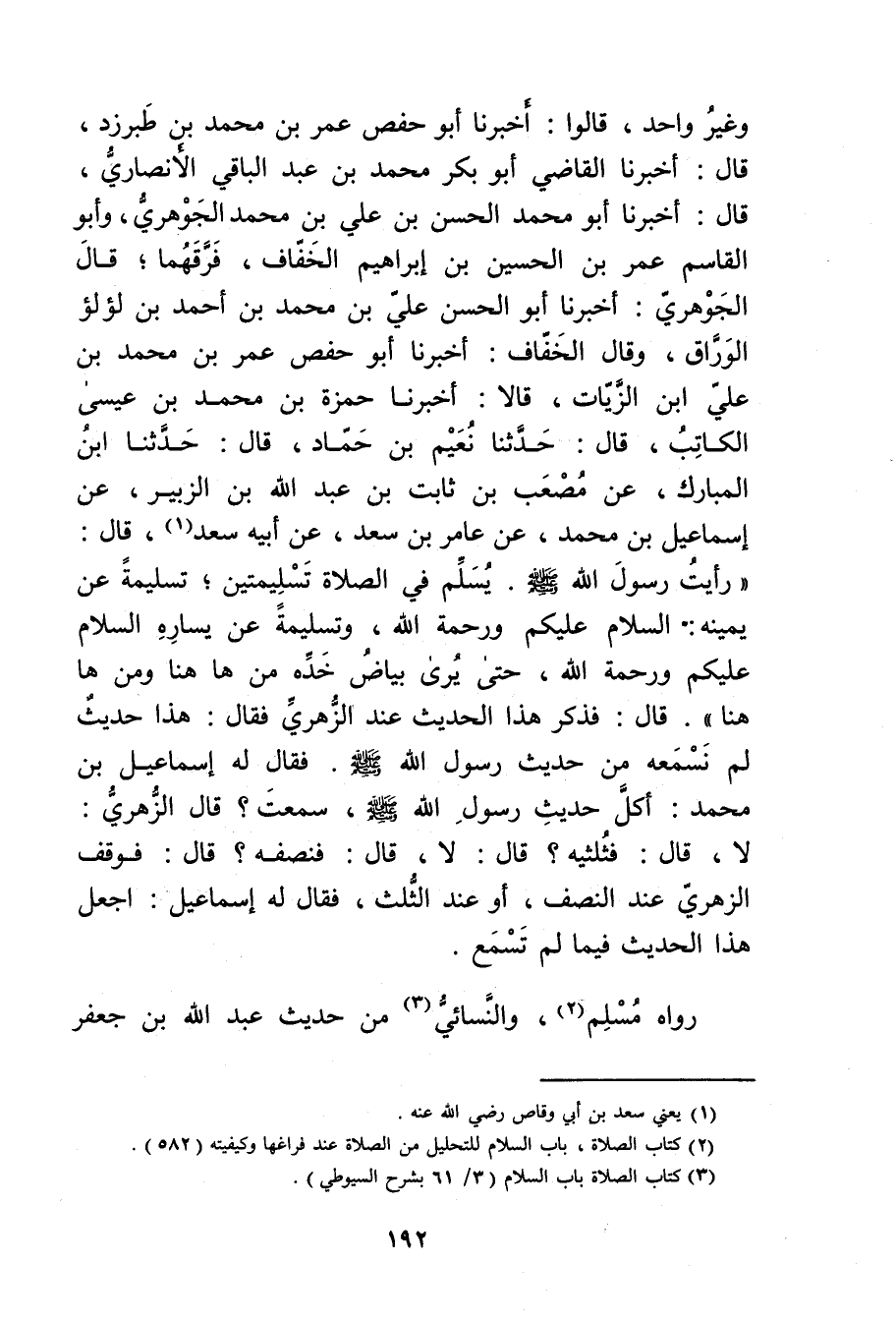 وغير واحد، قَالُوا: أَخْبَرَنَا أَبُو حَفْص عُمَر بن محمد بن طَبَرْزَذَ، قال: أخبرنا الْقَاضِي أَبُو بَكْرٍ محمد بن عبدا لباقي الأَنْصارِيّ، قال: أخبرنا أَبُو مُحَمَّدٍ الْحَسَن بْن علي بْن مُحَمَّد الْجَوْهَرِيُّ، وأَبُو الْقَاسِمِ عُمَر بْنُ الْحُسَيْنِ بْنِ إِبْرَاهِيمَ الْخَفَّافُ، فَرَّقَهُمَا، قال الْجَوْهَرِيُّ: أخبرنا أَبُو الْحَسَنِ عَلِيُّ بْنُ مُحَمَّدِ بْنِ أَحْمَدَ بْنِ لُؤْلُؤٍ الْوَرَّاقُ، وَقَال الْخَفَّافُ: أَخْبَرَنَا أَبُو حَفْص عُمَر بْن محمد بن علي ابن الزَّيَّاتِ، قَالا: أخبرنا حَمْزَةُ بْنُ مُحَمَّدِ بْنِ عِيسَى الْكَاتِبُ، قال: حَدَّثَنَا نُعَيْمُ بْنُ حَمَّادٍ، قال: حَدَّثَنَا ابْنُ الْمُبَارَكِ، عن مُصْعَبِ بْن ثابت بْن عَبد الله بْنِ الزُّبَيْرِ، عن إِسْمَاعِيلَ بْنِ مُحَمَّدٍ، عن عَامِرِ بْنِ سَعْدٍ، عَن أَبِيهِ سَعْدٍ (1) ، قال: رَأَيْتُ رَسُولَ صَلَّى اللَّهُ عَلَيْهِ وسَلَّمَ. يسلم في الصلاة تسلمتين، تَسْلِيمَةً عن يَمِينِهِ: السَّلامُ عَلَيْكُمْ ورَحْمَةُ اللَّهِ، وتَسْلِيمَةً عن يَسَارِهِ السَّلامُ عَلَيْكُمْ ورَحْمَةُ اللَّهِ، حَتَّى يرى بياض خده من ها هنا ومن ها هنا.