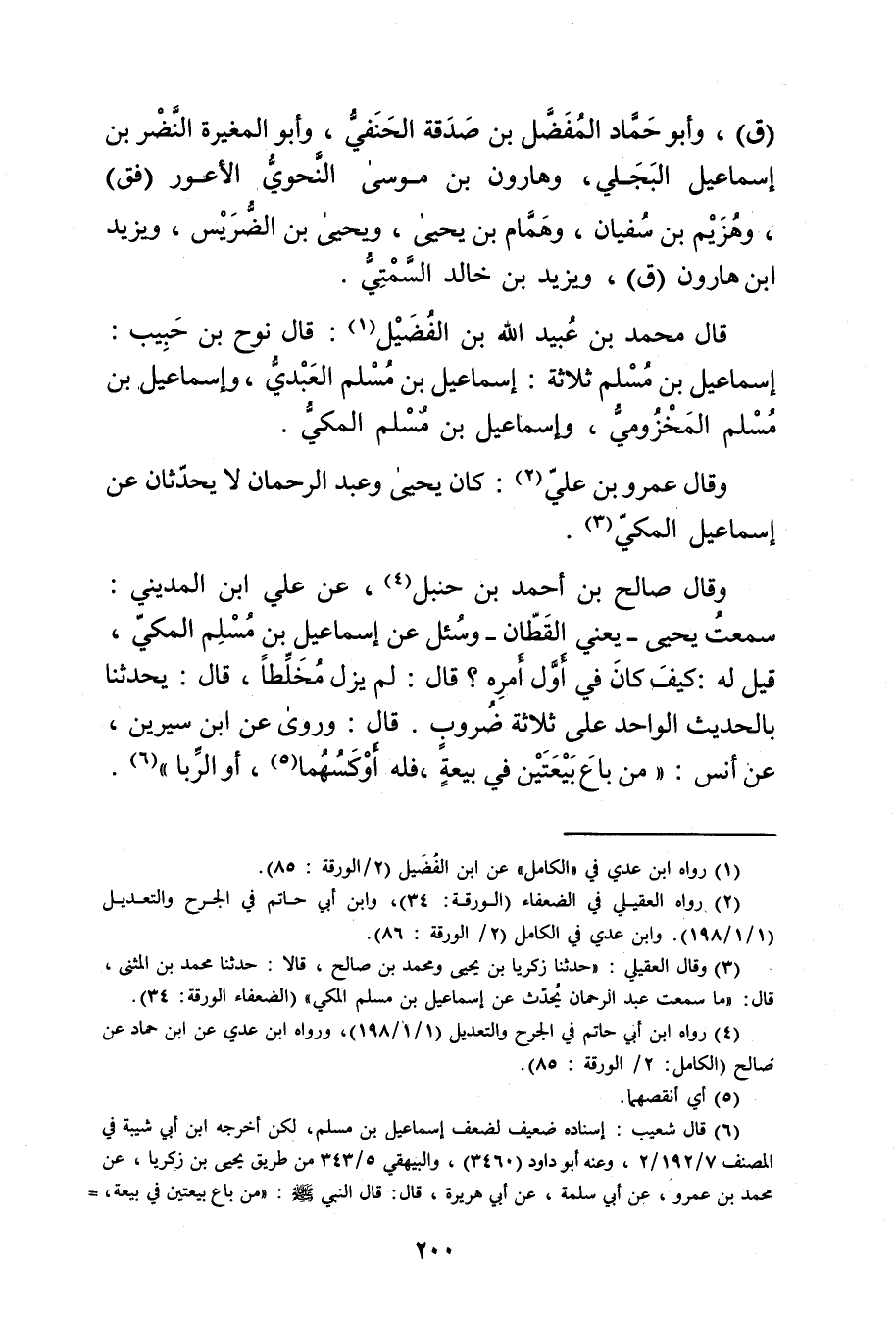 (3) وَقَال العقيلي: حَدَّثَنَا زكريا بن يحيى ومحمد بن صالح، قالا: حَدَّثَنَا مُحَمَّدُ بْنُ الْمُثَنَّى، قال: ما سمعت عَبْد الرَّحْمَنِ يحدث عن إِسْمَاعِيل بْن مسلم المكي" (الضعفاء الورقة: 34) .