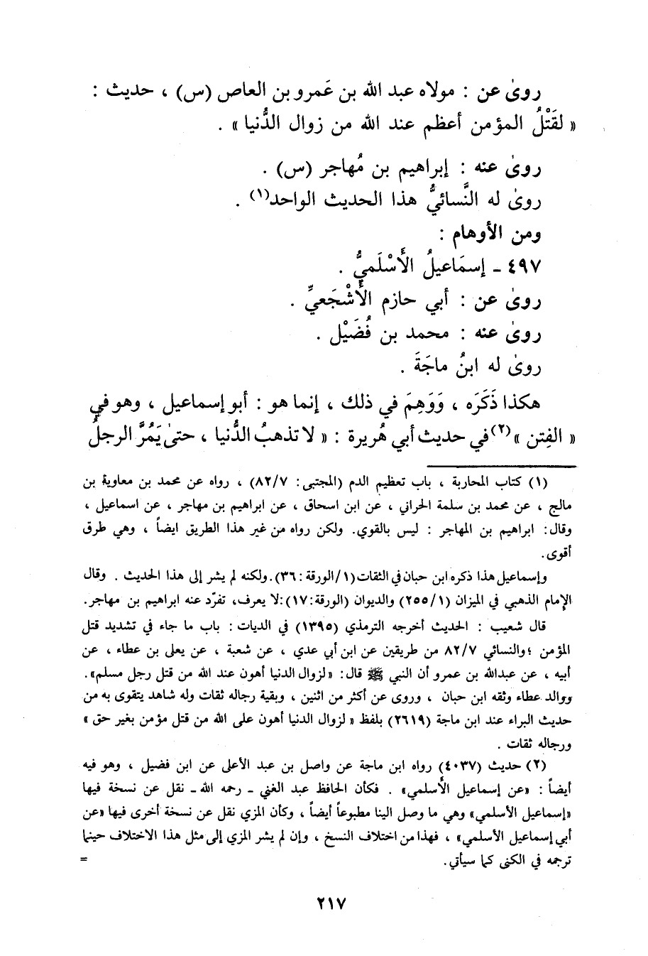 (1) كتاب المحاربة، باب تعظيم الدم (المجتبى: 7 / 82) ، رواه عن محمد بن معاوية بن مالج، عن مُحَمَّد بْن سَلَمَة الحراني، عن ابن إسحاق، عن إِبْرَاهِيمَ بْنِ مُهَاجِرٍ، عن إِسماعيل، وَقَال: ابراهيم بن المهاجر: ليس بالقوي. ولكن رواه من غير هذا الطريق ايضا، وهي طرق أقوى.