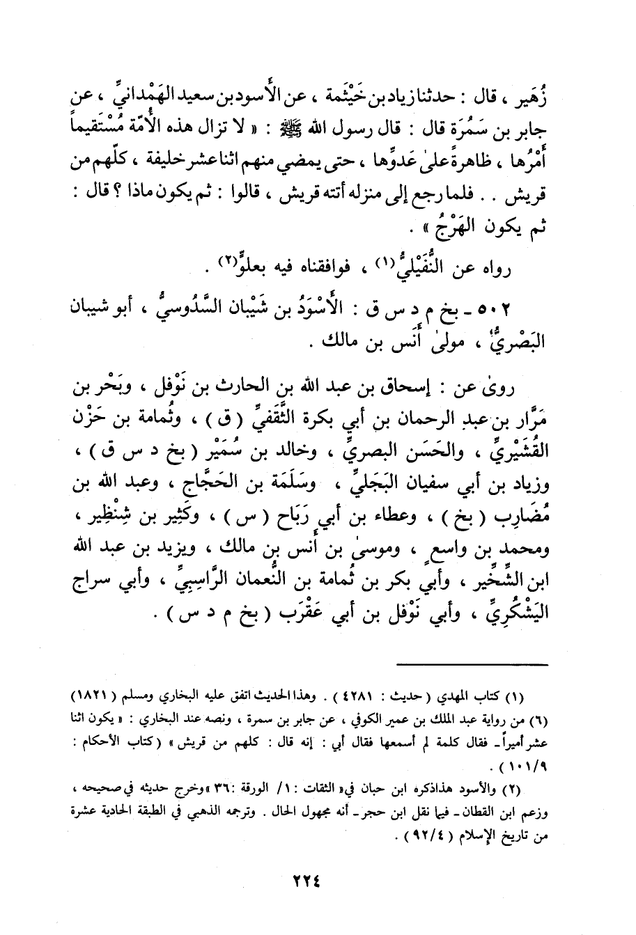 زُهَيرٌ، قال: حَدَّثَنَا زِيَادُ بْنُ خَيْثَمَةَ، عن الأَسْوَدِ بْنِ سَعِيد الْهَمْدَانِيِّ، عن جَابِرِ بْنِ سَمُرَة قال: قال رَسُولُ اللَّهِ صلى اللَّهُ عَلَيْهِ وسَلَّمَ: لا تَزَالُ هَذِهِ الأُمَّةُ مُسْتَقِيمًا أَمْرُهَا، ظَاهِرَةً عَلَى عَدُوِّهَا، حَتَّى يَمْضِيَ مِنْهُمُ اثْنا عَشَرَ خَلِيفَةً، كُلُّهُمْ مِنْ قُرَيْشٍ..فَلَمَّا رَجَعَ إِلَى مَنْزِلِهِ أَتَتْهُ قُرَيْشٌ، قَالُوا: ثُمَّ يَكُونُ مَاذَا؟ قال: ثُمَّ يَكُونُ الْهَرَجُ.
