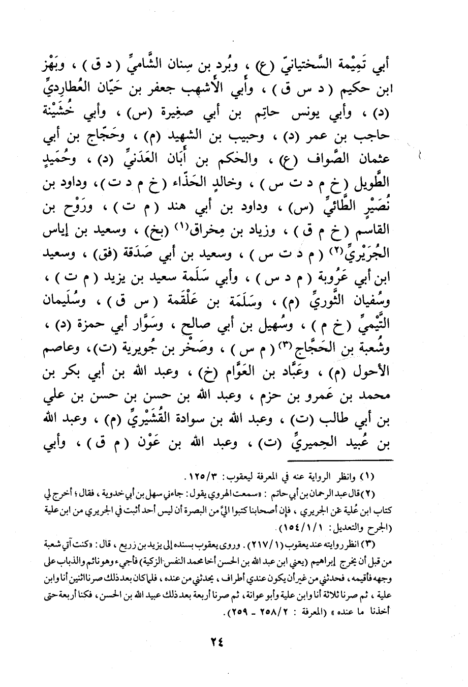 (3) انظر روايته عند يعقوب (1 / 217) . وروى يعقوب بسنده إلى يزيد بن زريع، قال: كنت آتي شعبة من قبل أن يخرج إبراهيم (يَعْنِي ابْن عَبد اللَّهِ بْن الحسن أخا محمد النفس الزكية) فأجئ وهو نائم والذباب على وجهه فأقيمه، فحدثني من غير أن يكون عندي أطراف، يحدثني من عنده، فلما كان بعد ذلك صرنا اثنين أنا وابن علية، ثم صرنا ثلاثة أنا وابن علية وأبو عوانة، ثم صرنا أربعة بعد ذلك عُبَيد الله بن الحسن، فكنا أربعة حتى أخذنا ما عنده" (المعرفة: 2 / 258 - 259) .
