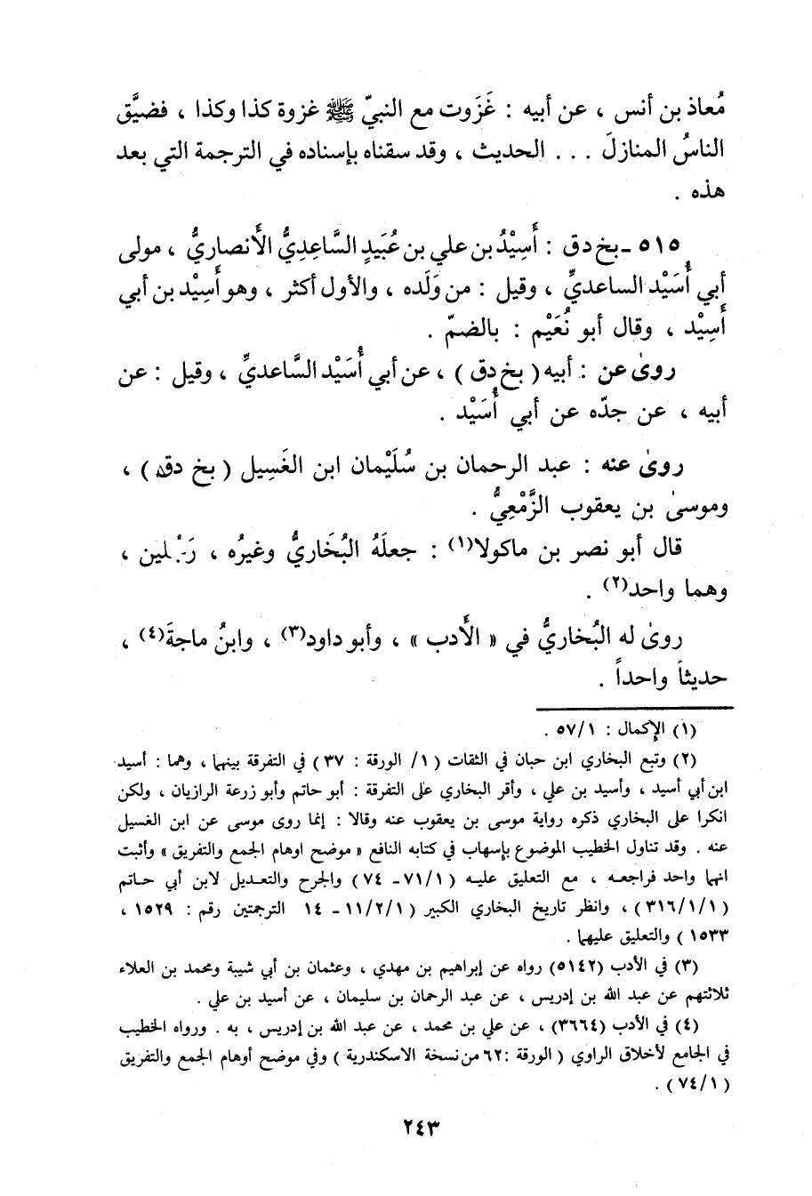 (515) - بخ د ق: أسيد بن علي بن عُبَيد الساعدي الأَنْصارِيّ، مولى أبي أسيد الساعدي، وقيل: من ولده، والأول أكثر، وهُوَ أسيد بْن أَبي أسيد، وَقَال أبو نعيم: بالضم.