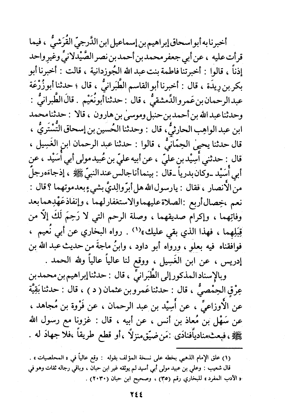 أَخْبَرَنَا بِهِ أَبُو إِسْحَاقَ إِبْرَاهِيمُ بن إسماعيل ابن الدَّرَجِيِّ الْقُرَشِيُّ، فِيمَا قَرَأْتُ عَلَيْهِ، عَن أَبِي جَعْفَرٍ مُحَمَّدِ بْنِ أَحْمَدَ بْنِ نَصْرٍ الصَّيْدَلانِيُّ وغَيْرُ واحِدٍ إِذْنا، قَالُوا: أَخْبَرَتْنا فَاطِمَةُ بِنْتُ عَبد اللَّهِ الْجُوزِدَانِيَّةُ، قَالَتْ: أخبرنا أَبُو بَكْرِ بْنُ رِيدَةَ، قال: أخبرنا أَبُو الْقَاسِمِ الطَّبَرَانِيُّ، قال، حَدَّثَنَا أَبُو زُرْعَة عَبْدُ الرَّحْمَنِ بْنُ عَمْرو الدِّمَشْقِيُّ، قال: حَدَّثَنَا أَبُو نُعَيْمٍ. قال الطَّبَرَانِيُّ: وحَدَّثَنَا عَبد اللَّهِ بْنُ أَحْمَدَ بْنِ حَنْبَلٍ ومُوسَى بْنُ هَارُونَ، قالا: حَدَّثَنَا محمد ابن عبد الواهب الْحَارِثِيُّ، قال: وحَدَّثَنَا الْحُسَيْنُ بْنُ إِسْحَاقَ التُّسْتَرِيُّ، قال حَدَّثَنَا يَحْيَى الْحِمَّانِيُّ، قَالُوا: حَدَّثَنَا عَبْدُ الرَّحْمَنِ ابن الْغَسِيلِ، قال حَدَّثَنِي أُسَيْدُ بْنُ عَلِيٍّ، عَن أَبِيهِ عَلِيِّ بْنِ عُبَيد مَوْلَى أَبِي أُسَيْدٍ، عَن أَبِي أُسَيْدٍ - وكَانَ بَدْرِيًّا، قال: بَيْنَمَا أنا جَالِسٌ عِنْدَ النَّبِيِّ صَلَّى اللَّهُ عَلَيْهِ وسَلَّمَ، إِذْ جَاءَهُ رَجُلٌ مِنَ الأَنْصَارِ، فَقَالَ: يَا رَسُولَ اللَّهِ هَلْ أَبَرُّ والِدَيَّ بشيءٍ بَعْدَ مَوْتِهِمَا؟ قال: نَعَمْ، خِصَالٌ أَرْبَعٌ: الصَّلاةُ عَلَيْهِمَا والاسْتِغْفَارُ لَهُمَا، وإِنْفَاذُ عَهْدِهِمَا بَعْدَ وفَاتِهِمَا، وإِكْرَامُ صَدِيقِهِمَا، وصِلَةُ الرَّحِمِ الَّتِي لا رِحَمَ لَكَ إِلا مِنْ قِبَلِهِمَا، فَهَذَا الَّذِي بَقِيَ عَلَيْكَ" (1) . رَوَاهُ الْبُخَارِيُّ عَن أَبِي نُعَيْمٍ، فَوَافَقْنَاهُ فِيهِ بِعُلُوٍّ، ورَوَاهُ أَبُو دَاوُدَ، وابْنُ مَاجَهْ مِنْ حَدِيثِ عَبد اللَّهِ بْنِ إِدْرِيسَ، عن ابْنِ الْغَسِيلِ، ووَقَعَ لَنا عالياً عالياً ولله الحمد.