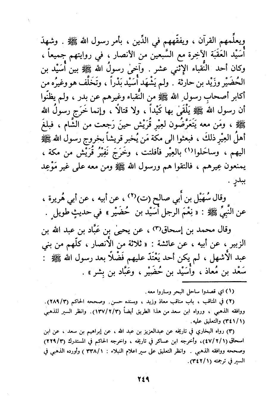 ويعلمهم القرآن، ويفقههم فِي الدين، بأمر رَسُول اللَّهِ صَلَّى اللَّهُ عَلَيْهِ وسَلَّمَ. وشهد أسيد العقبة الآخرة مع السبعين من الأنصار، فِي روايتهم جميعا. وكَانَ أحد النقباء الاثني عشر. وآخى رَسُول اللَّهِ صلى الله عليه وسلم بين أسيد بْن الحضير وزيد بْن حارثة. ولم يشهد أسيد بدرا، وتخلف هُوَ وغيره من أكابر أصحاب رَسُول اللَّهِ صَلَّى اللَّهُ عَلَيْهِ وسَلَّمَ من النقباء وغيرهم عن بدر، ولم يظنوا أن رَسُول اللَّهِ صَلَّى اللَّهُ عليه وسلم يلقى بها كيدا، ولا قتلا، وإنما خرج رَسُول اللَّهِ صَلَّى اللَّهُ عَلَيْهِ وسَلَّمَ، ومن معه يتعرضون لعير قريش حين رجعت من الشام، فبلغ أهل العير ذَلِكَ، فبعثوا إِلَى مكة من يخبر قريشا بخروج رَسُول اللَّهِ صَلَّى اللَّهُ عَلَيْهِ وسَلَّمَ إليهم، وساحلوا (1) بالعير فأفلتت، وخرج نفير قريش من مكة، يمنعون عيرهم، فالتقوا هم ورسول اللَّه صَلَّى اللَّهُ عليه وسلم ومن معه على غير موعد ببدر.
