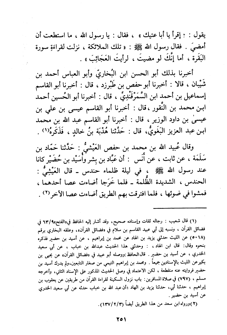 (1) قال شعيب: رجاله ثقات وإسناده صحيح وقد أشار إليه الحافظ في "الفتح"9 / 63 في فضائل القرآن ونسبه إلى أبي عُبَيد القاسم بن سلام في "فضائل القرآن"، وعلقمه البخاري برقم (5018) عن الليث حدثني يزيد بْنِ الْهَادِ عَنْ مُحَمَّدِ بْنِ إبراهيم، عن أسيد بن حضير فذكره بنحوه وَقَال، قال ابن الهاد،: وحدثني هذا الحديث عَبد اللَّهِ بْنِ خَبَّابٍ، عَن أبي سَعِيد الخُدْرِيّ، عن أسيد بن حضير. قال الحافظ: ووصله أبو عُبَيد في "فضائل القرآن"عَنْ يَحْيَى بْنِ بُكَيْرٍ عَنِ الليث بالإسنادين جميعا. ومحمد بن إبراهيم التَّيْمِيّ من صغار التابعين، ولم يدرك أسيد بن حضير فروايته عنه منقطعة، لكن الاعتماد في وصل الحديث المذكور على الإسناد الثاني، وأخرجه مسلم، (797) في صلاة المسافرين: باب نزول السكينة لقراءة القرآن من طريقين عن يعقوب بْن إِبْرَاهِيم، حَدَّثَنَا أبى، حَدَّثَنَا يزيد بن الهاد، أن عَبد الله بن خباب حدثه عَن أَبِي سَعِيد الخُدْرِيّ عَنِ أسيد بن حضير.