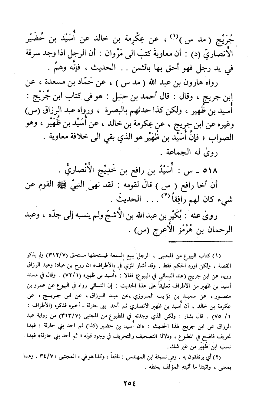 (1) كتاب البيوع من المجتبى، الرجل يبيع السلعة فيستحقها مستحق (7 / 312) ولم يذكر القصة، ولكن اورد الحكم فقط. وقد أشار المزي في "الاطراف" ان روح بن عبادة وعبد الرزاق روياه عن ابن جُرَيْج (عند النَّسَائي في البيوع) فقالا: أسيد بن ظهير" (1 / 72) . وَقَال في مسند أسيد بن ظهير من الاطراف تعليقا على هذا الحديث: إن النَّسَائي رواه في البيوع عَنْ عَمْرو بْنِ مَنْصُورٍ، عَنْ سَعِيد بن ذؤيب المروزي، عَنْ عبد الرزاق، عَنِ ابن جُرَيْج، عن عكرمة بْن خَالِد، أن أسيد بن ظهير الأَنْصارِيّ ثم أحد بني حارثة - أخبره فذكره (الاطراف: 1 / 75) . قال بشار: ولكن الذي وجدته في المطبوع من المجتبى (7 / 313) من رواية عبد الرزاق عَنِ ابن جُرَيْج لهذا الحديث: ان أسيد بن حضير (كذا) ثم احد بني حارثة"فهذا تحريف فاضح في المطبوع، ودلالة التصحيف والتحريف في وجود قوله"ثم أحد بني حارثة"فهذا نسب ابن ظهير من غير شك.