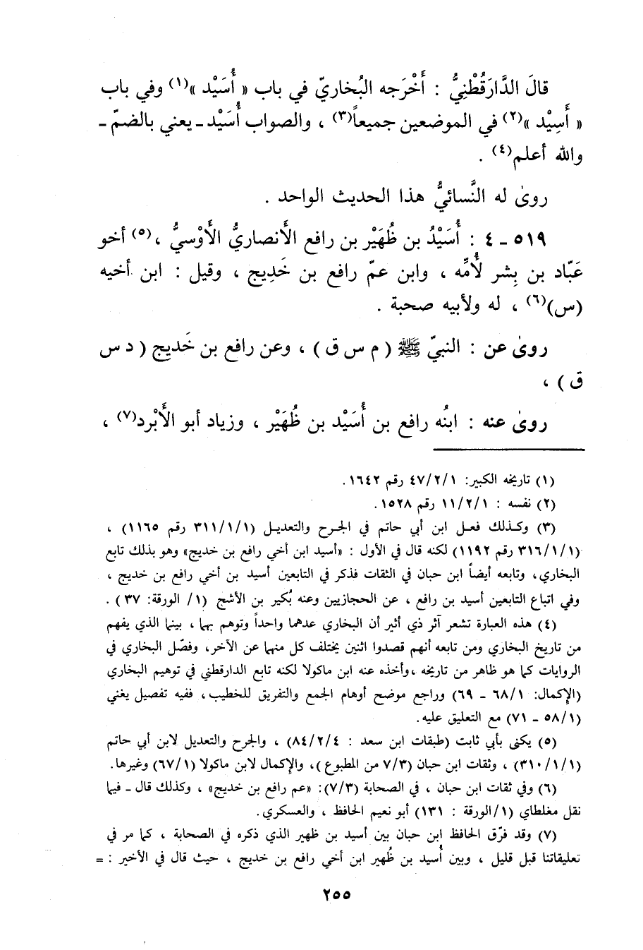 (3) وكذلك فعل ابن أَبي حاتم في الجرح والتعديل (1 / 1 / 311 رقم 1165) ، (1 / 1 / 316 رقم 1192) لكنه قال في الاول: أسيد ابْن أخي رافع بْن خديج"وهو بذلك تابع البخاري، وتابعه أيضا ابن حبان في الثقات فذكر في التابعين أسيد بن أخي رافع بن خديج، وفي اتباع التابعين أسيد بن رافع، عن الحجازيين وعنه بكير بن الاشج (1 / الورقة: 37) .
