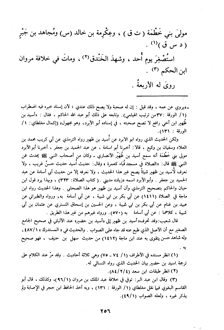 وتابعه على ذلك أبو عبد الله الحاكم، فقال: أسيد بن ظهير ابن أخي رافع لا تصح صحبته، في إسناده أبوالابرد، وهو مجهول" (إكمال مغلطاي: 1 / الورقة: 131) .
