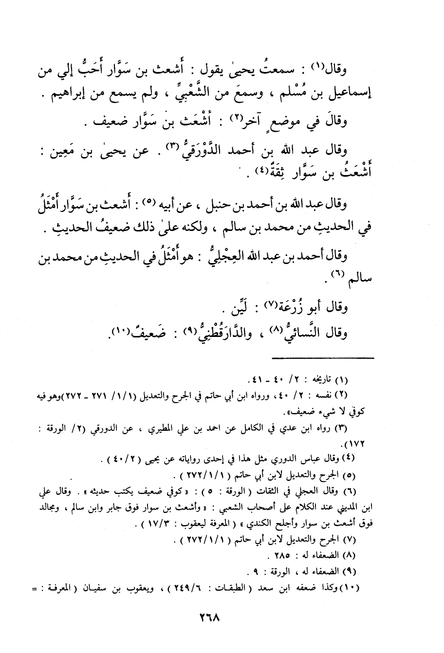 (6) وَقَال العجلي في الثقات (الورقة: 5) : كوفي ضعيف يكتب حديثه". وَقَال علي ابن المديني عند الكلام على أصحاب الشعبي: وأشعث بْن سوار فَوْقَ جَابِر وابن سالم، ومجالد فَوْقَ أشعث بن سوار وأجلح الكندي" (المعرفة ليعقوب: 3 / 17) .