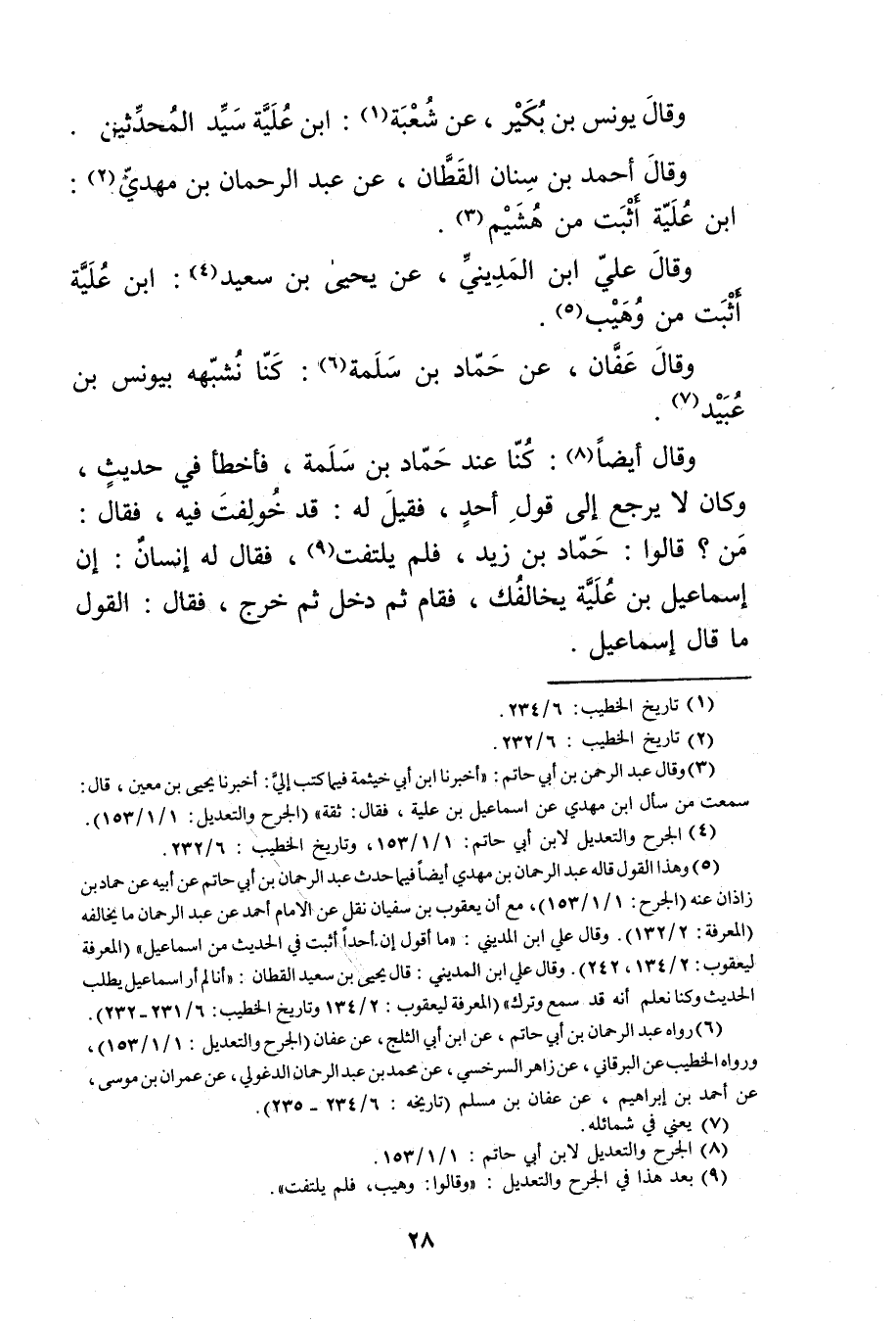 (5) وهذا القول قاله عَبْد الرحمن بْن مهدي أيضا فيما حدث عَبْد الرَّحْمَنِ بْن أَبي حَاتِم عَن أبيه عن حماد بن زاذان عنه (الجرح: 1 / 1 / 153) ، مع أن يعقوب بن سفيان نقل عن الإمام أحمد بن عبد الرحمن ما يخالفه (المعرفة 2 / 132) . وَقَال علي ابن المديني: ما أقول إن أحدًا أثبت في الحديث من إِسماعيل" (المعرفة ليعقوب: 2 / 134، 242) وَقَال علي ابن المديني: قال يحيى بن سَعِيد القطان: أنا لم أر إِسماعيل يطلب الحديث وكنا نعلم انه قد سمع وترك" (المعرفة ليعقوب: 2 / 134 وتاريخ الخطيب: 6 / 231 - 232) .