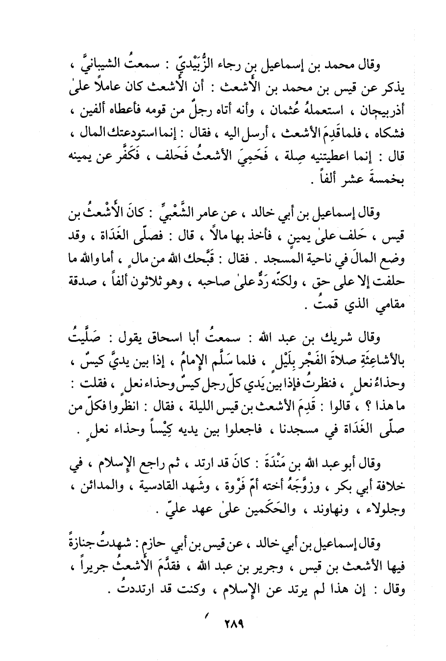 وَقَال مُحَمَّد بْن إِسْمَاعِيل بْن رجاء الزبيدي: سمعت الشيباني، يذكر عن قيس بْن مُحَمَّد بْن الأشعث كَانَ عاملا على أذربيجان، استعمله عثمان، وأنه أتاه رجل من قومه فأعطاه ألفين، فشكاه، فلما قدم الأشعث، أرسل إليه، فَقَالَ: إنما استودعتك المال، قال: إنما أعطيتنيه صلة، فحمي الأشعث فحلف، فكفر عن يمينه بخمسة عشر ألفا.