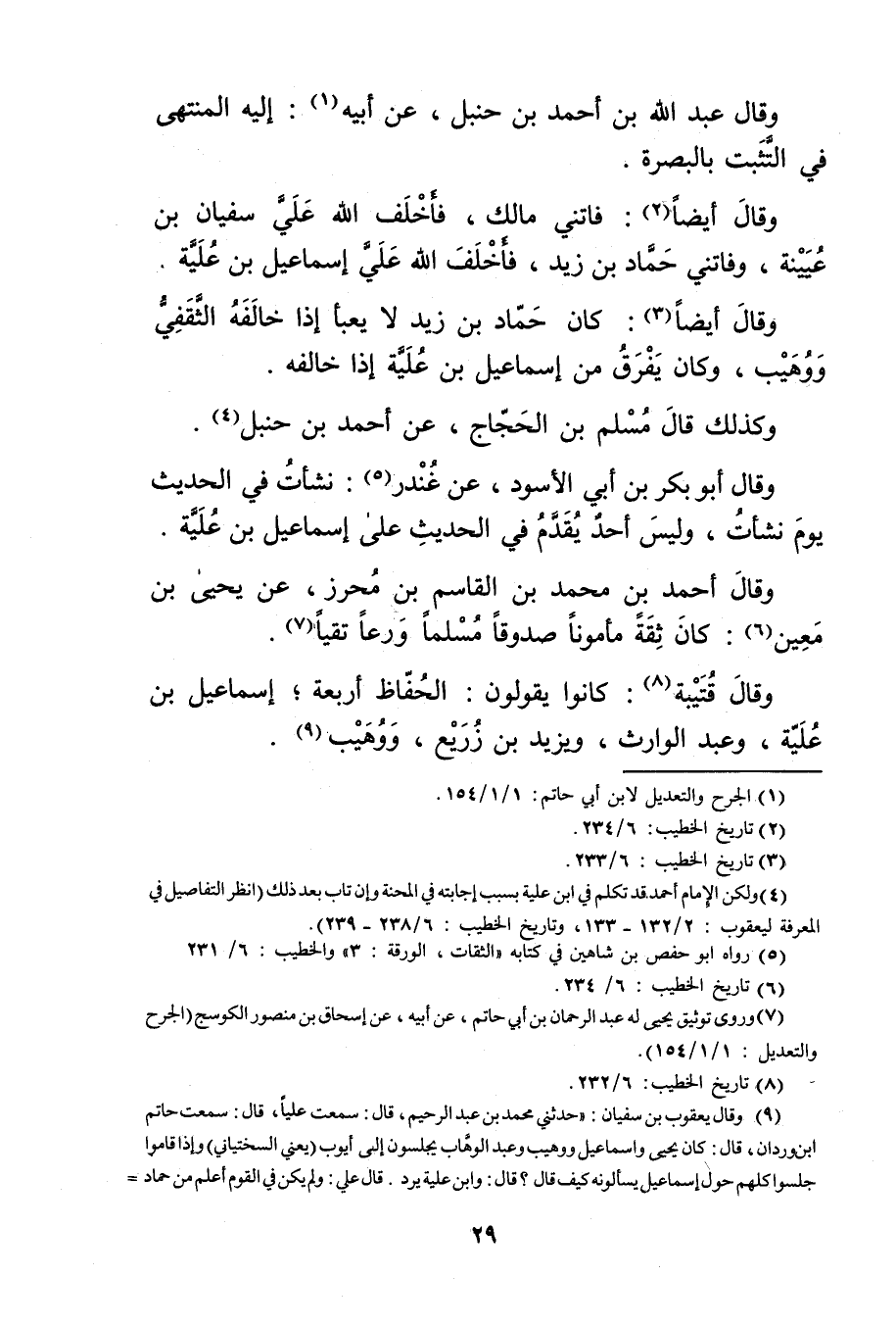 (4) ولكن الإمام أحمد قد تكلم في ابن علية بسبب إجابته في المحنة وإن تاب بعد ذلك (انظر التفاصيل في المعرفة ليعقوب: 2 / 132 - 133، وتاريخ الخطيب: 6 / 238 - 239) .