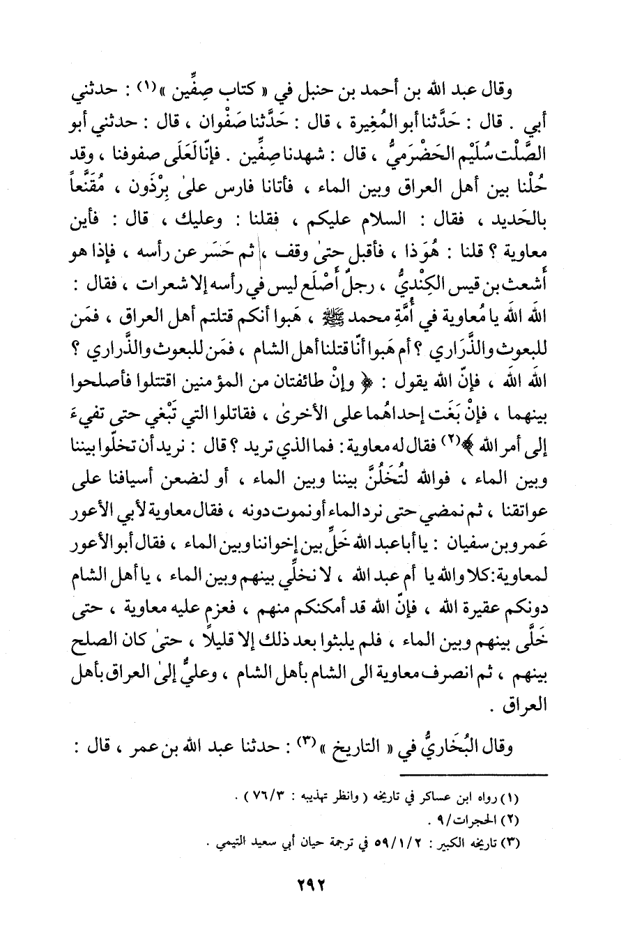 وَقَال عَبد اللَّهِ بْن أَحْمَد بْن حنبل فِي "كتاب صفين" (1) : حَدَّثني أبي. قال: خدثنا أَبُو المغيرة، قال حَدَّثَنَا صفوان، قال حدثني أَبُو الصلت سليم الحضرمي، قال: شهدنا صفين. فأنا لعلى صفوفنا، وقد حلنا بين أهل العراق وبين الماء، فأتانا فارس على برذون، مقنعا بالحديد، فَقَالَ: السلام عليكم، فقلنا: وعليك، قال: فأين مُعَاوِيَة؟ قلنا: هُوَ ذا، فأقبل حَتَّى وقف، ثم حسر عن رأسه، فإذا هُوَ أشعث بْن قيس الكندي، رجل أصلع ليس فِي رأسه إلا شعرات، فَقَالَ: اللَّه اللَّه يَا مُعَاوِيَة فِي أمة مُحَمَّد صَلَّى اللَّهُ عَلَيْهِ وسَلَّمَ، هبوا أنكم قتلتم أهل العراق، فمن للبعوث والذراري؟ أم هبوا أنا قتلنا أهل الشام، فمن للبعوث والذراري؟ اللَّه اللَّه، فإن اللَّه يقول: {وإن طائفتان من المؤمنين اقتتلوا فأصلحوا بينهما، فإن بغت إحداهما على الأخرى، فقاتلوا التي تبغي حتى تفئ إِلَى أمر اللَّه} (2) فَقَالَ لَهُ مُعَاوِيَة: فما الَّذِي تريد؟ قال: نريد أن تخلوا بيننا وبين الماء، فوالله لتخلن بيننا وبين الماء، أو لنضعن أسيافنا على عواتقنا، ثم نمضي حَتَّى نرد الماء أو نموت دونه، فَقَالَ مُعَاوِيَة لأبي الأَعور عَمْرو بْن سفيان: با أبا عَبد اللَّهِ خل بين إخواننا وبين الماء، فَقَالَ أَبُو الأعور لمعاوية: كلا والله يَا أما عَبد اللَّهِ، لا نخلي بينهم وبين الماء، يَا أهل الشام دونكم عقيرة اللَّه، فإن اللَّه قد أمكنكم منهم، فعزم عليه مُعَاوِيَة، حَتَّى خلى بينهم وبين الماء، فلم يلبثوا بعد ذَلِكَ إلا قليلا، حَتَّى كَانَ الصلح بينهم، ثم انصرف مُعَاوِيَة إِلَى الشام بأهل الشام، وعلي إلي العراق بأهل العراق.