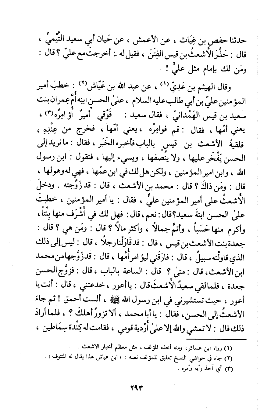 وَقَال الهيثم بْن عدي (1) ، عن عَبد اللَّهِ بْن عياش (2) : خطب أمير المؤمنين علي بْن أَبي طالب عليه السلام، على الحسن بنه أم عِمْران بنت سَعِيد بْن قيس الهمداني، فَقَالَ سَعِيد: فوقي أمير أو امره (3) يعني أمها، فَقَالَ: قم فوامره، يعني أمها، فخرج من عنده، فلقيه الاشعت بْن قيس بالباب فأخبره الخبر، فَقَالَ: ما نريد إِلَى الحسن يفخر عليها، ولا ينصفها، ويسئ إليها، فتقول: ابن رَسُول اللَّهِ، وابن أمير المؤمنين، ولكن هل لك فِي ابن عمها، فهي لَهُ وهُوَ لَهَا، قال: ومن ذاك؟ قال: مُحَمَّد بْن الأشعث، قال: قد زوجته. ودخل الأشعث على أمير المؤمنين علي، فَقَالَ: يَا أمير المؤمنين، خطبت على الحسن بنة سَعِيد؟ قال: نعم، قال: فهل لك فِي أشرف منها بنتا، وأكرم منا حسبا، وأتم جمالا، وأكثر مالا؟ قال: ومن هي؟ قال: جعدة بنت الأشعث بْن قيس، قال: قد قوالنا رجلا، قال: ليس إِلَى ذَلِكَ الَّذِي قاولته سبيل، قال: فارقني ليؤامر أمها: قال: قد زوجها من محمد ابن الأشعث، قال: متى؟ قال: الساعة بالباب، قال: فزوج الحسن جعدة، فلما لقي سَعِيد الأشعث قال: يَا أعور، خدعتني، قال: أنت يَا أعور، حيث تستشيرني فِي ابن رَسُول اللَّهِ صَلَّى اللَّهُ عَلَيْهِ وسَلَّمَ، ألست أحمق! ثم جاء الأشعث إِلَى الحسن، فَقَالَ: يَا أبا مُحَمَّد، ألا تزور أهلك؟ فلما أراد ذَلِكَ قال: لا تمشي والله إلا على أردية قومي، فقامت لَهُ كندة سماطين،