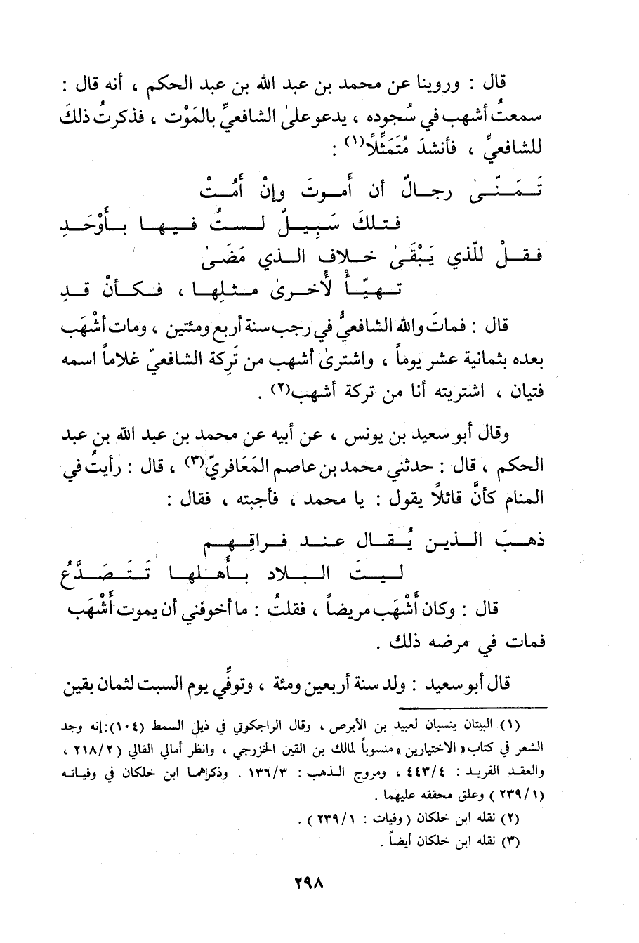 قال: فمات والله الشافعي فِي رجب سنة أربع ومئتين، ومات أشهب بعده بثمانية عشر يوما، واشترى أشهب من تركة الشافعي غلاما اسمه فتيان، اشتريت أنا من تركة أشهب (2) .