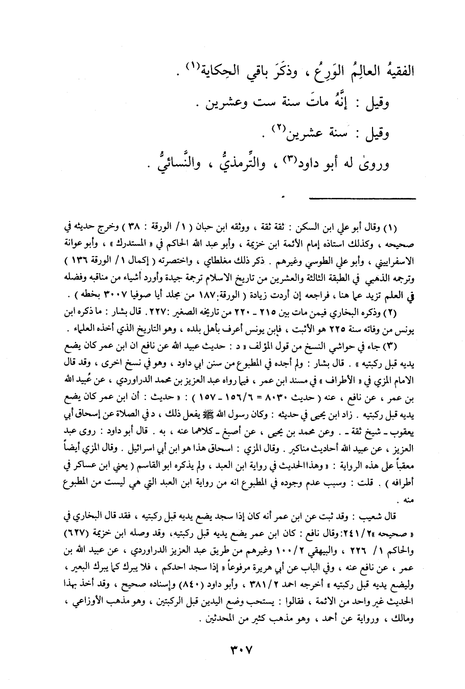(3) جاء في حواشي النسخ من قول المؤلف"د: حديث عُبَيد الله عن نافع ان ابن عُمَر كان يضع يديه قبل ركبتيه". قال بشار: ولم أجده في المطبوع من سنن أبي داود، وهو في نسخ اخرى، وقد قال الإمام المزي في "الاطراف" في مسند ابن عُمَر، فيما رواه عبد العزيز بن محمد الدَّراوَرْدِيّ، عن عُبَيد الله بن عُمَر، عن نافع، عنه (حديث 8030 = 6 / 156 - 157) : حديث: أن ابن عُمَر كان يضع يديه قبل ركبتيه.