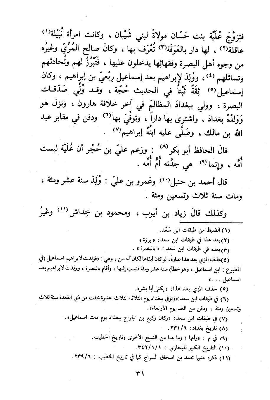 (4) حذف المزي بعد هذا عبارة، لو كان أبقاها لكان أحسن، وهي: فولدت لابراهيم إِسماعيل (في المطبوع: ابن إِسماعيل، وهو خطأ) سنة عشر ومئة فنسب إليها، وأقام بالبصرة، وولدت لابراهيم بعد إِسماعيل....