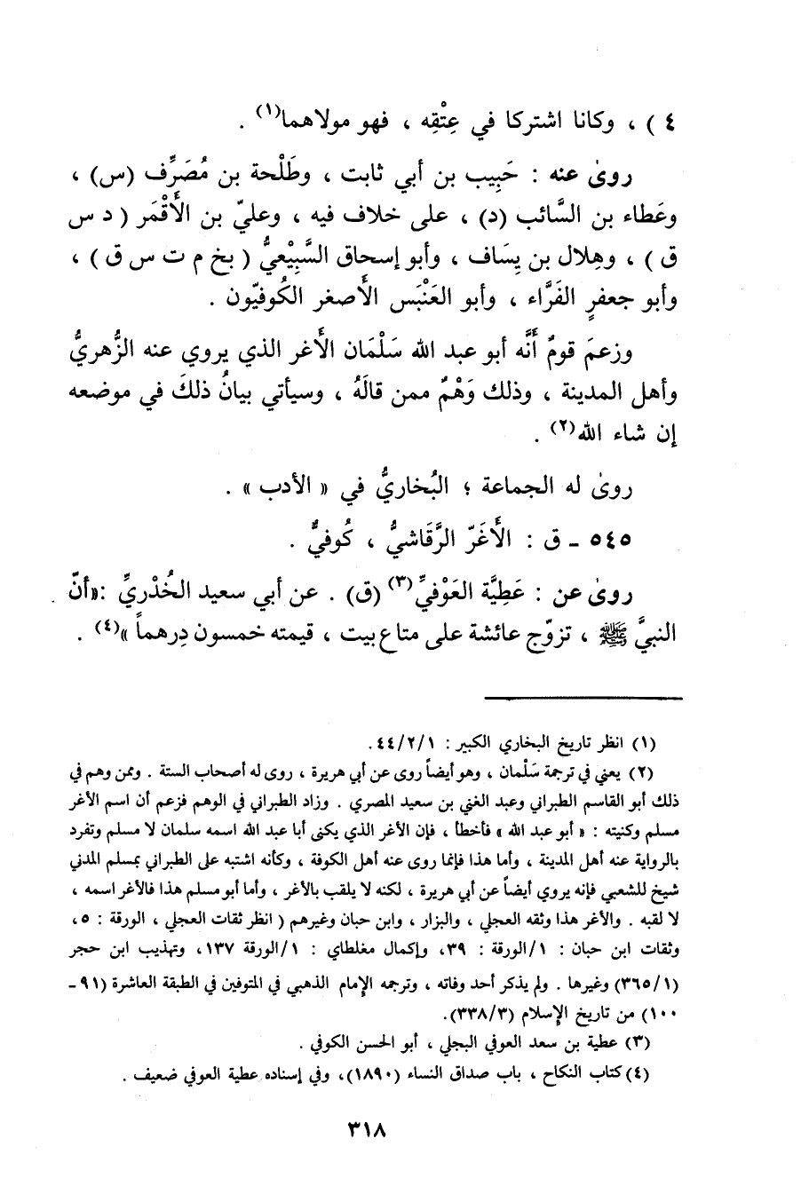 (2) يعني في ترجمة سلمان، وهو أيضا روى عَن أبي هُرَيْرة، روى له أصحاب الستة. وممن وهم في ذلك أبو القاسم الطبراني وعبد الغني بن سَعِيد المِصْرِي. وزاد الطبراني في الوهم فزعم أن اسم الأَغَر مسلم وكنيته: أبو عبد الله"فأخطأ، فإن الأَغَر الذي يكنى أبا عَبد الله اسمه سلمان لا مسلم وتفرد بالرواية عنه أهل المدينة، وأما هذا فإنما روى عنه أهل الكوفة، وكأنه اشتبه على الطبراني بمسلم المدني شيخ للشعبي فإنه يروي أيضا عَن أبي هُرَيْرة، لكنه لا يلقب بالأَغَر، وأما أبو مسلم هذا فالأَغَر اسمه، لا لقبه. والأَغَر هذا وثقه العجلي، والبزار، وابن حبان وغيرهم (انظر ثقات العجلي، الورقة: 5، وثقات ابن حبان: الورقة: 39، وإكمال مغلطاي: 1 / الورقة 137، وتهذيب ابن حجر (1 / 365) وغيرها. ولم يذكر أحد وفاته، وترجمه الإمام الذهبي في المتوفين في الطبفة العاشرة (91 - 100) من تاريخ الاسلام (3 / 338) .