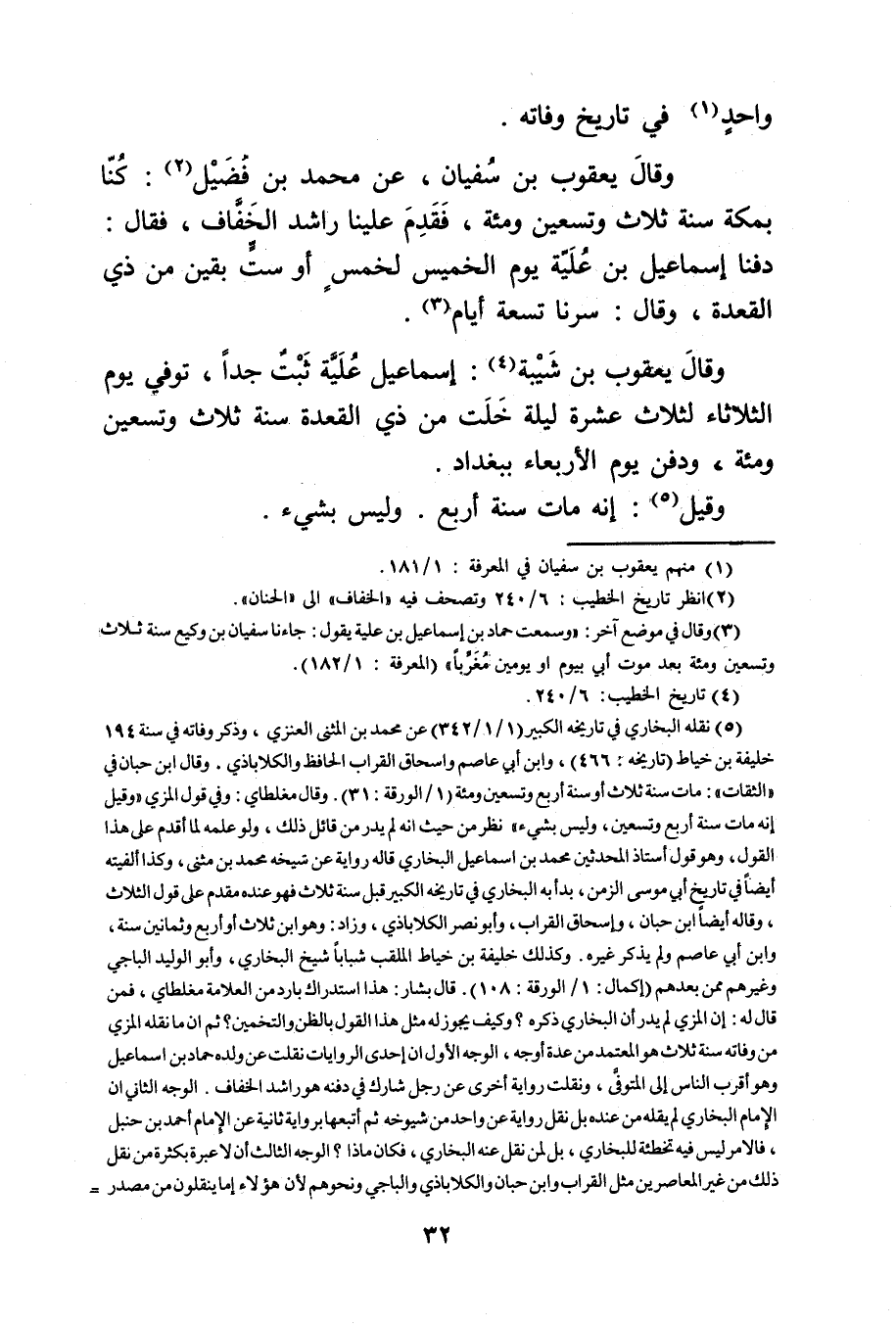 (5) نقله البخاري في تاريخه الكبير (1 / 1 / 342) عن محمد بن المثنى العنزي، وذكر وفاته في سنة 194 خليفة بن خياط (تاريخه: 466) ، وابن أَبي عاصم واسحاق القراب الحافظ والكلاباذي، وَقَال ابن حبان في "الثقات": مات سنة ثلاث أو سنة أربع وتسعين ومئة (1 / الورقة: 31) . وَقَال مغلطاي: وفي قول المزي"وقبل إنه مات سنة أربع وتسعين، وليس بشيءٍ"نظر من حيث انه لم يدر من قائل ذلك، ولو علمه لما أقدم على هذا القول، وهو قول أستاذ المحدثين محمد بن إِسماعيل البخاري قاله رواية عن شيخه محمد بن مثنى، وكذا ألفيته أيضا في تاريخ أبي موسى الزمن، بدأ به البخاري في تاريخه الكبير قبل سنة ثلاث فهو عنده مقدم على قول الثلاث، وَقَاله أيضا ابن حبان، وإسحاق القراب، وأبو نصر الكلاباذي، وزاد: وهو ابن ثلاث أو أربع وثمانين سنة، وابن أَبي عاصم ولم يذكر غيره. وكذلك خليفة بن خياط الملقب شبابا شيخ البخاري، وأبو الوليد الباجي وغيرهم ممن بعدهم (إكمال: 1 / الورقة: 108) . قال بشار: هذا استدراك بارد من العلامة مغلطاي، فمن قال له: إن المزي لم يدر أن البخاري ذكره؟ وكيف يجوز له مثل هذا القول بالظن والتخمين؟ ثم ان ما نقله المزي من وفاته سنة ثلاث هو المعتمد من عدة أوجه، الاول ان إحدى الروايات نقلت عن ولده حماد بن إِسماعيل وهو أقرب الناس إلى المتوفى، ونقلت رواية أخرى عن رجل شارك في دفنه هو راشد الخفاف، الوجه الثاني ان الإمام البخاري لم يقله من عنده بل نقل رواية عن واحد من شيوخه ثم أتبعها برواية ثانية عن الإمام أحمد بن حنبل، فالامر ليس فيه تخطئة للبخاري، بل لمن نقل عنه البخاري، فكان ماذا؟ الوجه الثالث أن لا عبرة بكثرة من نقل ذلك من غير المعاصرين مثل القراب وابن حبان والكلاباذي والباجي ونحوهم لان هؤلاء إما ينقلون من مصدر =