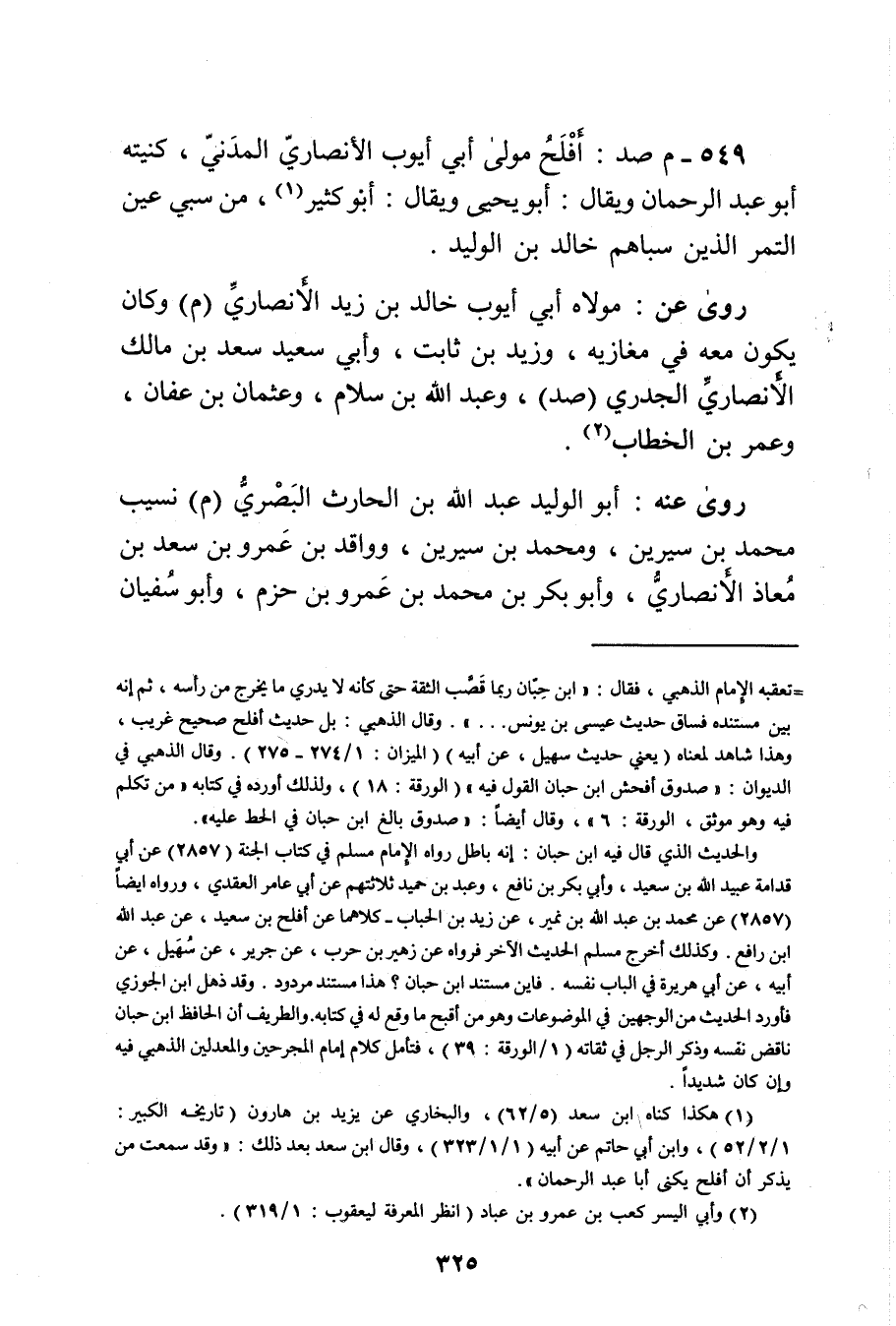 (549) - م صد: أفلح مولى أبي أَيُّوب الأَنْصارِيّ المدني، كنيته أَبُو عبد الرحمن ويُقال: أبويحيى ويُقال: أَبُو كثير (1) ، من سبي عين التمر الذين سباهم خَالِد بْن الوليد.