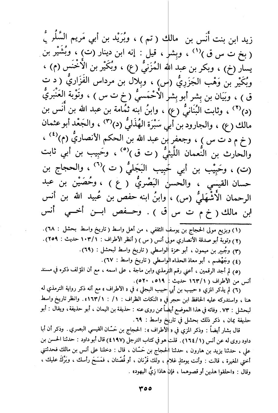 (6) لم يذكر المزي"حبيب بن أَبي حبيب البجلي"في "الاطراف" مع أنه ذكر رواية التِّرْمِذِيّ له هنا، واستدركه عليه الحافظ ابن حجر في "النكات الظراف: 1 / 163". وانظر تاريخ واسط لبحشل: 73. وفاته في هذا والموضع أيضا ممن رَوَى عَنه: حذيفة بن اليمان، أبو حذيفة، ويُقال: أبو حذيفة يمان، ذكر ذلك بحشل في تاريخ واسط: 69. قال بشار أيضا: وذكر المزي في "الاطراف": الحجاج بن حسان القيسي البَصْرِيّ. وذكر أن أبا داود روى له عن أنس (1 / 164) . قلت هو في كتاب الترجل (4197) قال أبو داود: حَدَّثَنَا الحسن بن علي، حَدَّثَنَا يزيد بن هارون، حَدَّثَنَا الحجاج بن حسان، قال: دخلنا على أنس بن مالك فحدثتني أختي المغيرة، قالت: وأنت يومئذ غلام، ولك قرنان، أو قصتان، فمسح رأسك، وبرك عليك، وَقَال: احلقوا هذين أو قصوهما، فإن هاذا زي اليهود".