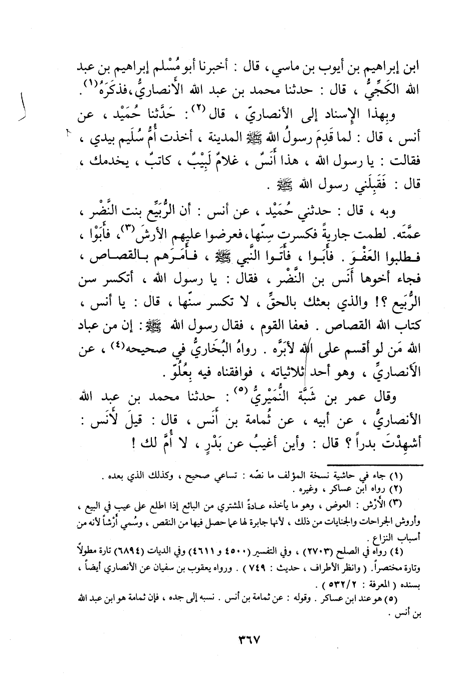 فَأَبَوْا، فَأَتَوْا النَّبِيَّ صَلَّى اللَّهُ عَلَيْهِ وسَلَّمَ، فَأَمَرَهُمْ بِالْقَصَاصِ، فَجَاءَ أَخُوهَا أَنَسُ بْنُ النَّضْرِ، فَقَالَ: يَا رَسُولَ اللَّهِ، أَتَكْسِرُ سِنَّ الرَّبِيعِ؟ ! والَّذِي بَعَثَكَ بِالْحَقِّ، لا تَكْسِرْ سِنَّهَا، قال: يَا أَنَسُ، كِتَابُ اللَّهِ الْقَصَاصُ. فَعَفَا الْقَوْمُ، فَقَالَ رَسُول اللَّهِ صلى الله عليه وسَلَّمَ: إِنَّ مِنْ عِبَادِ اللَّهِ مَنْ لَوْ أَقْسَمَ عَلَى اللَّهِ لأَبَرَّهُ. رَوَاهُ الْبُخَارِيُّ فِي صَحِيحِهِ (4) ، عن الأَنْصارِيّ، وهُوَ أَحَدُ ثُلَاثِيَّاتِهِ، فَوَافَقْنَاهُ فِيهِ بِعُلُوٍّ.