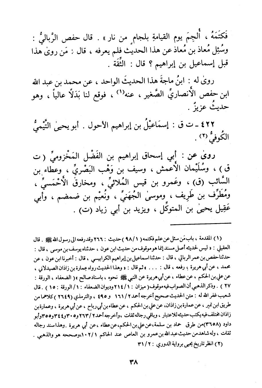 فَكَتَمَهُ، أُلْجِمَ يَوْمَ الْقِيَامَةِ بِلِجَامٍ مِنْ نَارٍ". قال حَفْصٌ الرَّبَالِيُّ: وسئل مُعَاذُ بْنُ مُعَاذٍ عن هَذَا الْحَدِيثِ فَلَمْ يَعْرِفْهُ، قال: مَنْ رَوَى هَذَا قَبْلَ إِسْمَاعِيلَ بْنِ إِبْرَاهِيمَ؟ قال: الثِّقَةُ.
