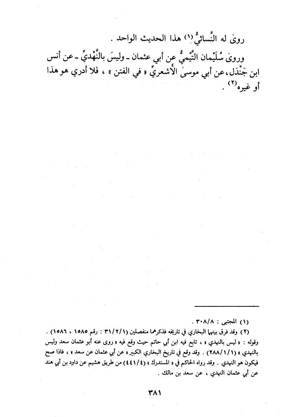(2) وقد فرق بينهما الْبُخَارِيّ في تاريخه فذكرهما منفصلين (1 / 2 / 31: رقم 1585، 1586) . وقوله: ليس بالنهدي"، تابع فيه ابن أَبي حاتم حيث وقع فيه"روى عنه أبو عثمان سعد وليس بالنهدي" (1 / 1 / 288) . وقد وقع في تاريخ البخاري الكبير"عَن أبي عثمان عن سعد"، فإذا صح فيكون هو النهدي. وقد رواه الحاكم في "المستدرك" (4 / 441) من طريق هشيم عن داود بن أَبي هند عَن أبي عثمان النهدي، عن سعد بن مالك.