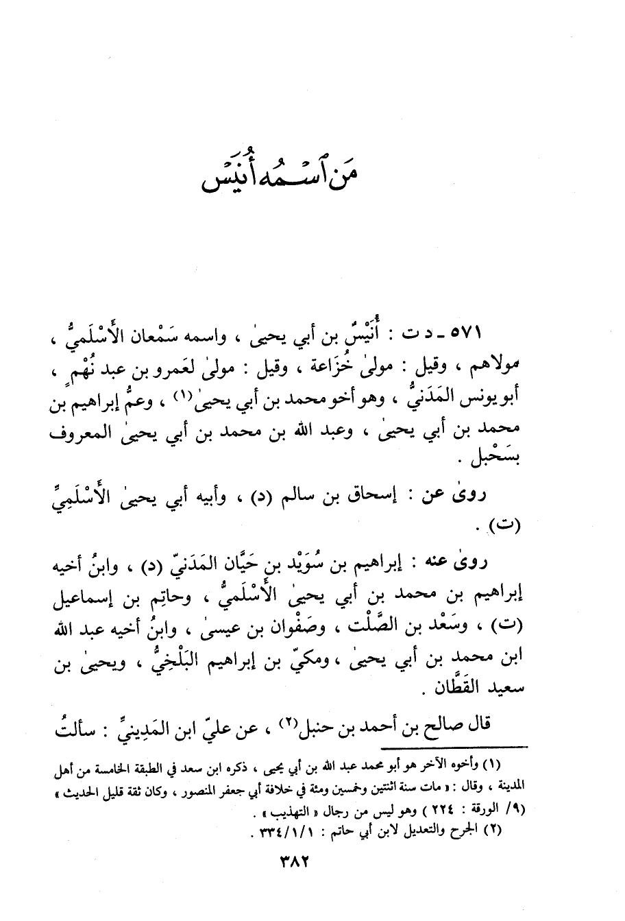 (571) - د ت: أنيس بن أَبي يَحْيَى، واسمه سمعان الأَسلميّ، مولاهم، وقيل: مولى خزاعة، وقيل: مولى لعُمَر بْن عبد نهم، أَبُو يونس المدني، وهُوَ أخو مُحَمَّد بْن أَبي يَحْيَى (1) ، وعم إِبْرَاهِيم بْن مُحَمَّد بْن أَبي يَحْيَى، وعبد الله بْن مُحَمَّد بْن أَبي يَحْيَى المعروف بسحبل.