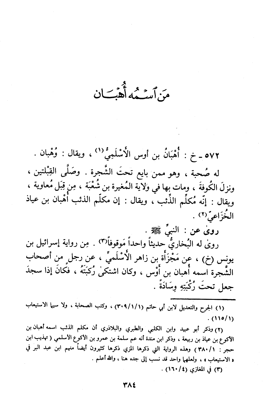 (572) - خ: أهبان بن أوس الأَسلميّ (1) ، ويُقال: وهبان. لهُ صُحبَةٌ، وهُوَ ممن بايع تحت الشجرة. وصلى القبلتين، ونزل الكوفة، ومات بها فِي ولاية المغيرة بْن شعبة، من قبل معاوية، ويُقال: إنه مكلم الذئب، ويُقال: إن مكلم الذئب أهبان بْن عياذ الخزاعي (2) .