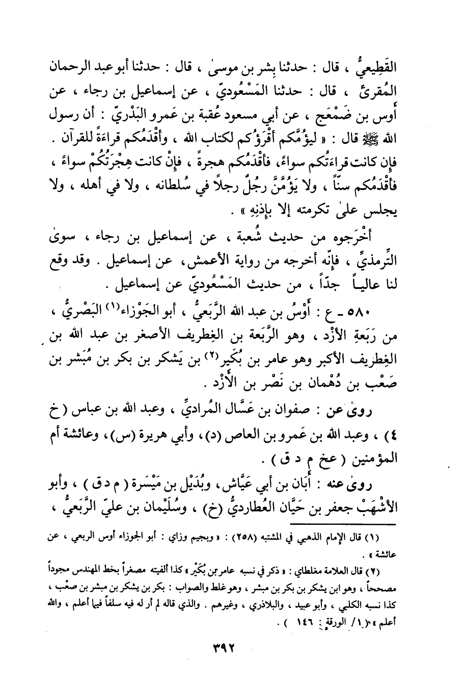 القَطِيعِيّ، قال: حَدَّثَنَا بشر بْن مُوسَى، قال: حَدَّثَنَا أَبُو عَبْدِ الرَّحْمَنِ الْمُقْرِئُ، قال: حَدَّثَنَا الْمَسْعُودِيُّ، عن إِسْمَاعِيلَ بْنِ رَجَاءٍ، عن أَوْسِ بْنِ ضَمْعَجٍ، عَن أَبِي مَسْعُودٍ عُقْبَةَ بْنِ عَمْرو الْبَدْرِيِّ: أن رَسُول اللَّهِ صَلَّى اللَّهُ عَلَيْهِ وسَلَّمَ قال: لِيَؤُمَّكُمْ أَقْرَؤُكُمْ لِكِتَابِ اللَّهِ، وأَقْدَمُكُمْ قِرَاءَةً لِلْقُرْآنِ.