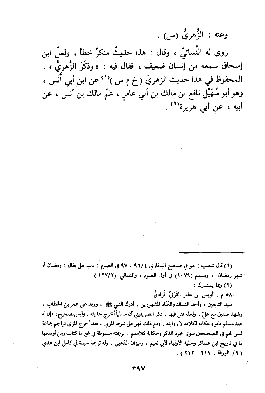 روى له النَّسَائي، وَقَال: هَذَا حديث منكر خطأ، ولعل ابْن إِسْحَاق سمعه من إنسان ضعيف، فَقَالَ فيه: وذكر الزُّهْرِيّ". المحفوظ فِي هَذَا حديث الزُّهْرِيّ (خ م س) (1) عن ابن أَبي أَنَس، وهُوَ أَبُو سهيل نافع بْن مالك بْن أَبي عامر، عم مالك بْن أَنَس، عَن أبيه، عَن أبي هُرَيْرة (2) .