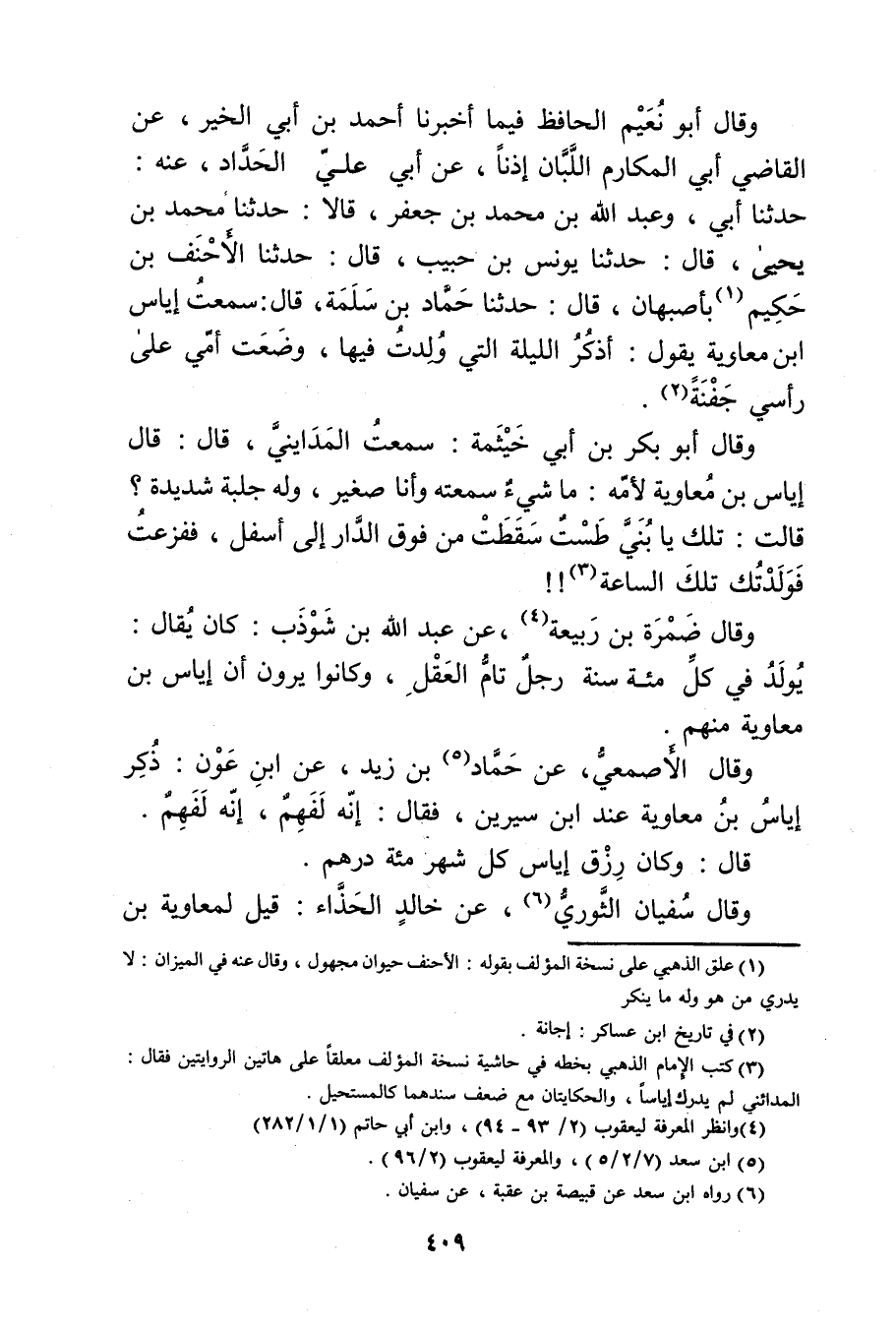 (3) كتب الإمام الذهبي بخطه في حاشية نسخة المؤلف معلقا على هاتين الروايتين فقال: المدائني لم يدرك إياسا، والحكايتان مع ضعف سندهما كالمستحيل.