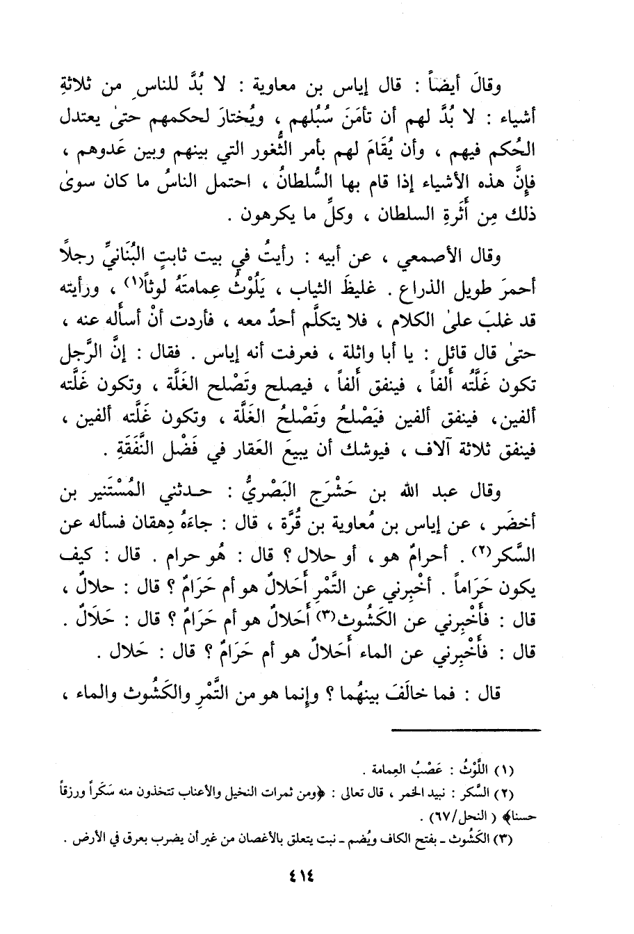 وَقَال عَبد اللَّهِ بن حرشج البَصْرِيّ: حدثني المستنير بْن أخضر، عن إياس بْن مُعَاوِيَة بْن قرة، قال: جاء دهقان فسأله عن السكر (2) . أحرام هُوَ، أو حلال؟ قال: هُوَ حرام. قال: كيف يكون حراما. أخبرني عن التمر أحلال هُوَ أم حرام؟ قال: حلال، قال: فأخبرني عن الكشوث (3) أحلال هُوَ أم حرام؟ قال حلال، قال: فأخبرني عن الماء أحلال هُوَ أم حرام؟ قال: حلال.
