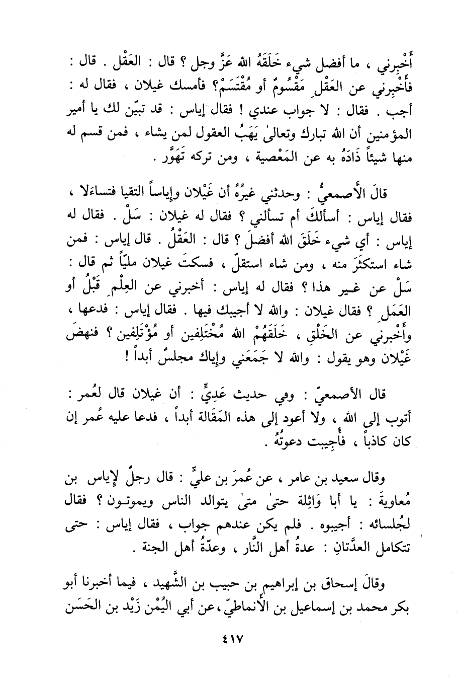 أخبرني، ما أفضل شيء خلقه الله عزوجل؟ قال: العقل. قال: فأخبرني عن العقل مقسوم أو مقتسم؟ فأمسك غيلان، فَقَالَ لَهُ: أجب. فَقَالَ: لا جواب عندي! فَقَالَ إياس: قد تبين لك يَا أمير المؤمنين أن اللَّه تبارك وتعالى يهب العقول لمن يشاء، فمن قسم لَهُ منها شيئا ذاده به عن المعصية، ومن تركه تهور.