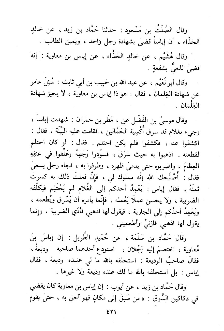 وَقَال موسى بْن الفضل عن، مطر بْن حمران: شهدت إياسا، وجئ بغلام قد سرق أكسية الحمالين، فقامت عليه البينة، فَقَالَ: اكشفوا عنه، فكشفوا فلم يكن احتلم. فَقَالَ: لو كَانَ احتلم لقطعته. اذهبوا به حيث سرق، فسودوا وجهه وعلقوا فِي عنقه العظام، واضربوه حَتَّى يدمى ظهره، وطوفوا به، فجاء رجل يسعى فَقَالَ: أصلحك اللَّه إنه مملوك لي، فإن فعلت ذَلِكَ به كسرت ثمنه، فَقَالَ إياس: يعمد أحدكم إِلَى الغلام لم يحتلم فيكلفه الضريبة، ولا يحسن عملا يعمله، فإنما يأمره أن يسرق ويطعمه، ويعمد أحدكم إِلَى الجارية، فيقول لَهَا اذهبي فأدي الضريبة، وإنما يقول لَهَا اذهبي فازني وأطعميني.