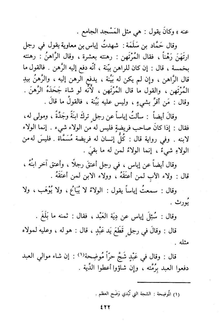 وَقَال أيضا: سألت إياسا عن رجل ترك ابنة وجدة، ومولى لَهُ، فَقَالَ: إذا كَانَ صاحب فريضة فليس لَهُ من الولاء شئ. إنما الولاء لابنه. وفي رواية قال: كل إنسان لَهُ فريضة مسماة. فليس لَهُ من الولاء شيء، إنما الولاء لمن لَهُ ما بقي.