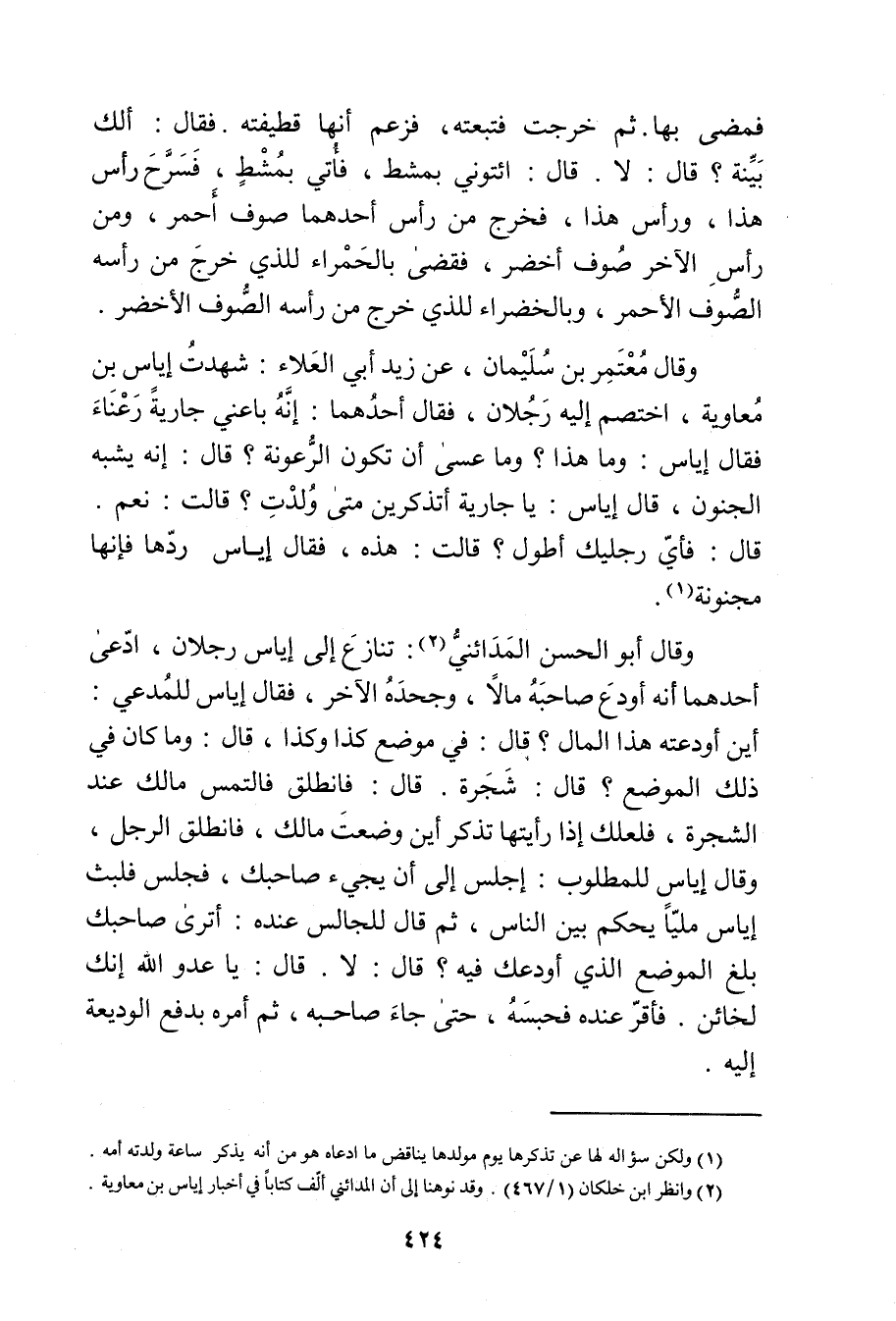 (2) وانظر ابن خلكان (1 / 467) . وقد نوهنا إلى أن المدائني ألف كتابا في أخبار إياس بن معاوية.