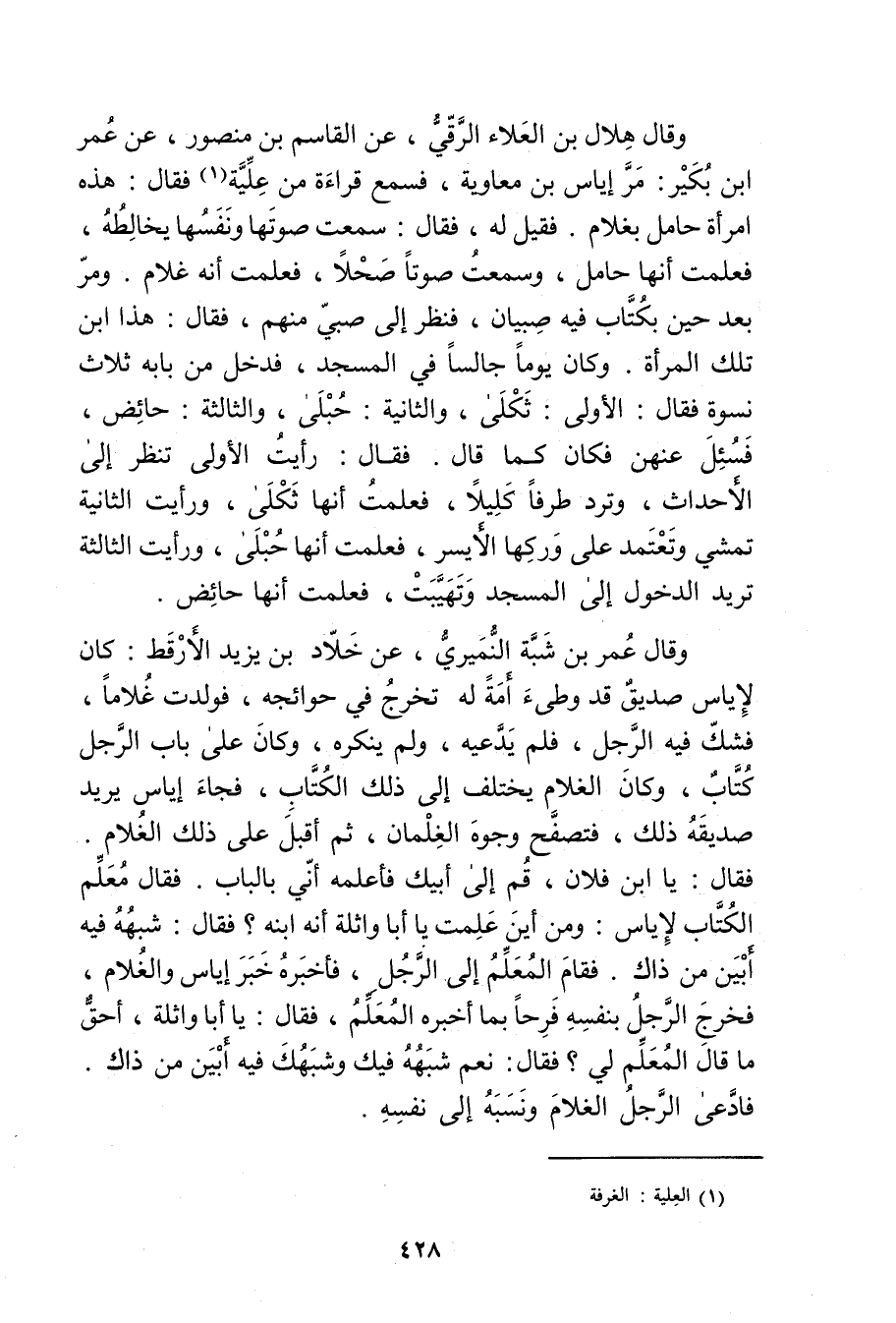 وَقَال هلال بْن العلاء الرَّقِّيّ، عن القاسم بْن منصور، عن عُمَر ابن بكير: مر إياس بْن مُعَاوِيَة، فسمع قراءة من علية (1) فَقَالَ: هذه امرأة حامل بغلام. فقيل لَهُ، فَقَالَ: سمعت صوتها ونفسها يخالطه، فعلمت أنها حامل، وسمعت صوتا صحلا، فعلمت أنه غلام. ومر بعد حين بكتاب فيه صبيان، فنظر إِلَى صبي منهم، فقال: هذا ابن بلك المرأة. وكَانَ يوما جالسا فِي المسجد، فدخل من بابه ثلاث نسوة فَقَالَ: الأولى ثكلى، والثانية: حبلى، والثالثة: حائض، فسئل عنهن فكان كما قال. فَقَالَ: رأيت الأولى تنظر إِلَى الأحداث، وترد طرفا كليلا، فعلمت أنها ثكلى، ورأيت الثانية تمشي وتعتمد على وركها الأيسر، فعلمت أنها حبلى، ورأيت الثالثة تريد الدخول إِلَى المسجد وتهيبت، فعلمت أنها حائض.