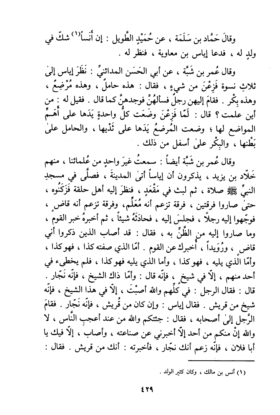 وَقَال حَمَّادُ بْنُ سَلَمَةَ، عَنْ حميد الطويل: إن أنسا (1) شك فِي ولد لَهُ، فدعا إياس بْن مُعَاوِيَة، فنظر لَهُ.