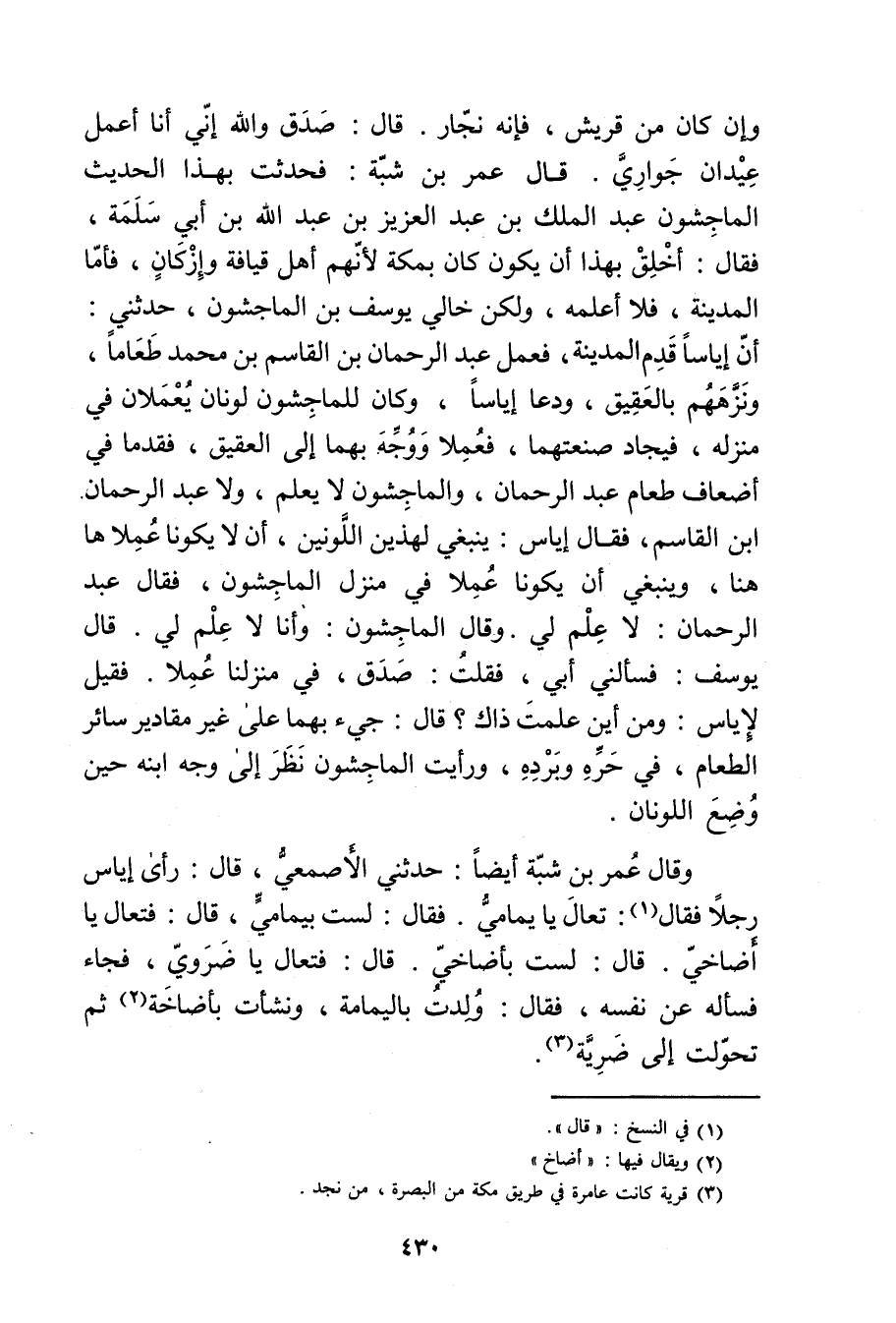 وَقَال عُمَر بْن شبة أيضا: حدثني الأَصْمَعِيّ، قال: رأى إياس رجلا فَقَالَ (1) : تعال يَا يمامي. فَقَالَ: لست بيمامي، قال: فتعال يَا أضاخي. قال: لست بأضاخي. قال: فتعال يَا ضروي، فجاء فسأله عن نفسه، فَقَالَ: ولدت باليمامة، ونشأت بأضاخة (2) ثم تحولت إِلَى ضرية (3) .