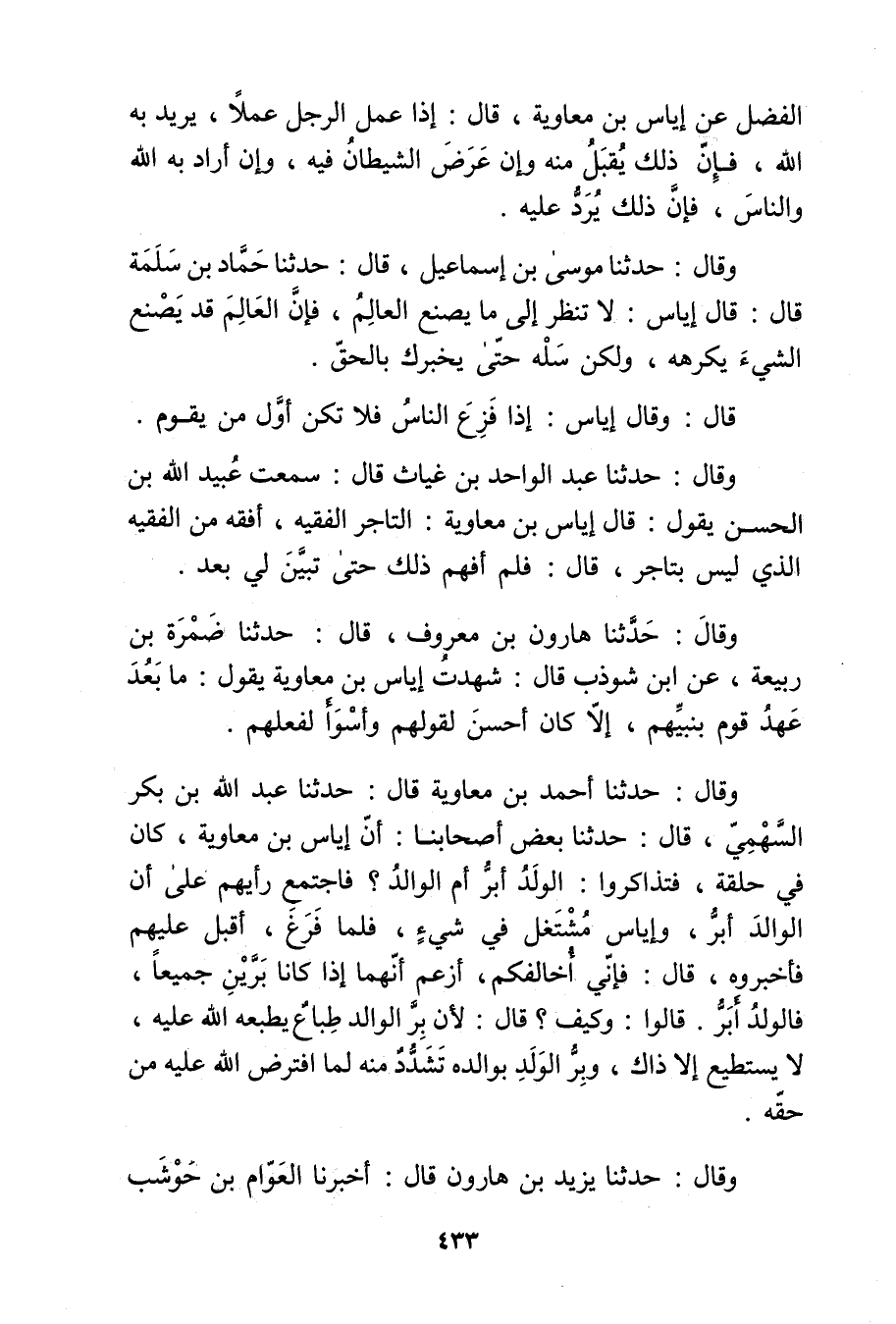 وَقَال: حَدَّثَنَا أَحْمَد بْن مُعَاوِيَة قال: حَدَّثَنَا عَبد اللَّهِ بْن بكر السهمي، قال: حَدَّثَنَا بعض أصحابنا: أن إياس بْن مُعَاوِيَة، كَانَ فِي حلقة، فتذاكروا: الولد أبر أم الوالد؟ فاجتمع رأيهم على أن الوالد أبر، وإياس مشتغل فِي شيء، فلما فرغ، أقبل عليهم فأخبروه، قال: فإني أخالفكم، أزعم أنهما إذا كانا برين جميعا، فالولد أبر. قَالُوا: وكيف؟ قال: لأن بر الوالد طباع يطبعه اللَّه عليه، لا يستطيع إلا ذاك، وبر الولد بوالده تشدد منه لما افترض اللَّه عليه من حقه.