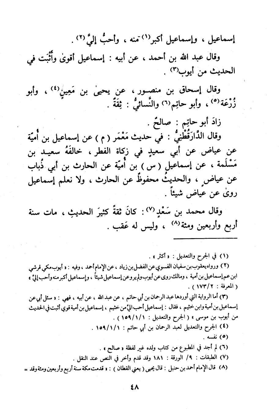 (2) ورواه يعقوب بن سفيان الفسوي عن الفضل بن زياد، عن الإمام أحمد، وفيه: أيوب مكي قرشي ابْن عم إِسْمَاعِيل بْن أمية، ومالك روى عن أيوب ولم يرو عن إسماعيل شياء، وإسماعيل أكبر منه وأحب إلي" (المعرفة: 2 / 173) .