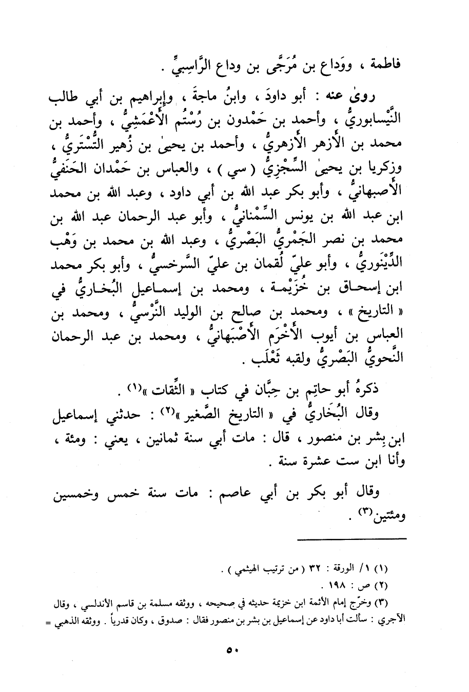 (3) وخرج إمام الأئمة ابن خزيمة حديثه في صحيحه، ووثقة مسلمة بن قاسم الاندلسي، وَقَال الآجري: سألت أبا داود عن إِسْمَاعِيل بن بشر بن منصور فقال: صدوق، وكان قدريا. ووثقة الذهبي =