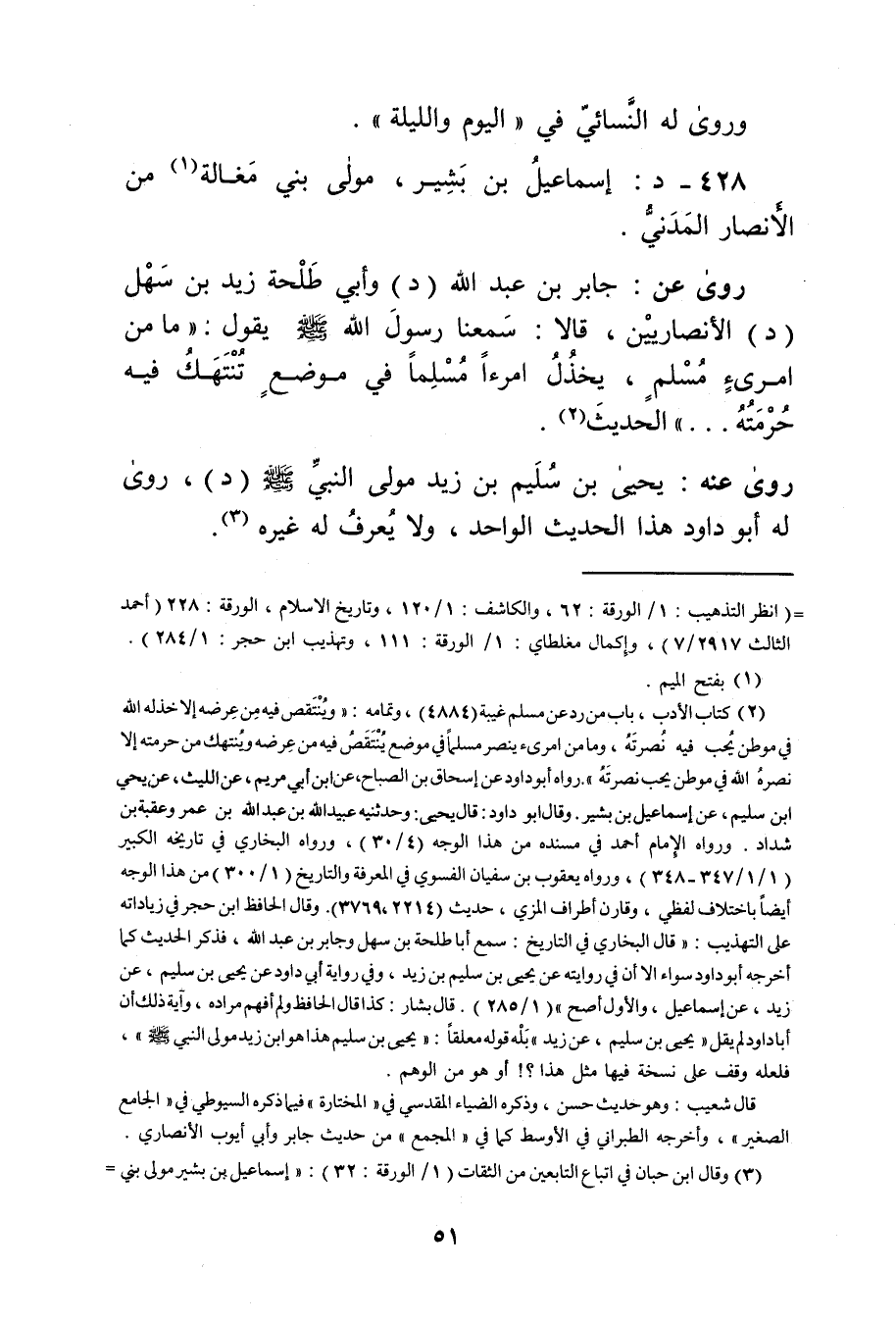 (2) كتاب الادب، باب من رد عن مسلم غيبة (4884) ، وتمامه: وينتقص فيه من عرضه إلا خذله الله في موطن يحب فيه نصرته، وما من امرئ ينصر مسلما في موضع ينتقص فيه من عرضه وينتهك من حرمته إلا نصره الله في موطن يحب نصرته". رواه أبو داود عن إسحاق بن الصباح، عن ابن أَبي مريم، عن الليث، عن يحي ابن سلميم، عن إسماعيل بن بشير. وَقَال أبو داود: قال يحيى: وحدثنيه عُبَيد الله بن عَبد الله بن عُمَر وعقبة بن شداد. ورواه الإمام أحمد في مسنده من هذا الوجه (4 / 30) ، ورواه البخاري في تاريخه الكبير (1 / 1 / 347 - 348) ، ورواه يعقوب بن سفيان الفسوي في المعرفة والتاريخ (1 / 300) من هذا الوجه أيضا باختلاف لفظي، وقارن أطراف المزي، حديث (2214، 3769) . وَقَال الحافظ ابن حجر في زياداته على التهذيب: قال البخاري في التاريخ: سمع أبا طلحة بن سهل وجابر بن عَبد الله، فذكر الحديث كما أخرجه أبو داود سواء الا أن في روايته عن يحيى بن سليم بن زيد، وفي رواية أبي داود عن يحيى بن سليم، عن زيد، عن إسماعيل، والاول أصح" (1 / 285) . قال بشار: كذا قال الحافظ ولم أفهم مراده، وآية ذلك أن أبا داود لم يقل"يحيى بن سليم، هن زيد"بله قوله معلقا: يحيى بن سليم هذا هو ابن زيد مولى النبي صلى الله عليه وسلم"، فلعله وقف على نسخة فيها مثل هذا؟ ! أو هو من الوهم.